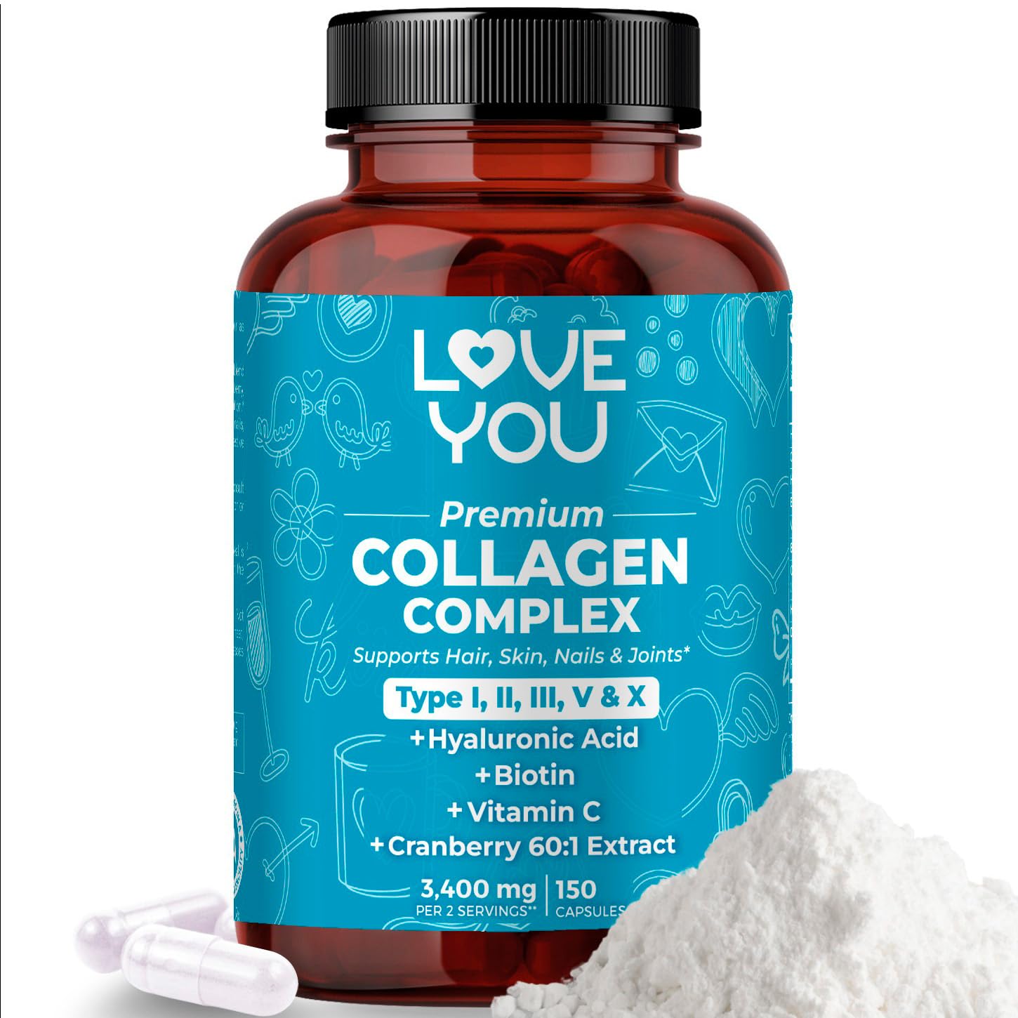 Love You Premium Collagen Complex Types I, II, III, V & X Hair, Skin, Nails, Joints & Gut Support Hydrolyzed Bovine Collagen Peptides Grass-Fed, Non-GMO, 120 Capsules, USA Made