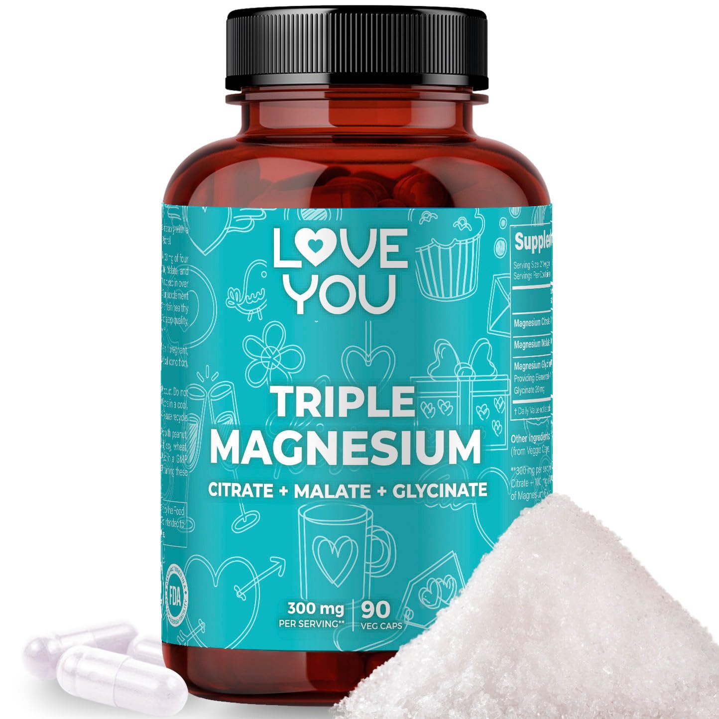 Love You Triple Magnesium Complex 300mg per Serving, Premium Magnesium Glycinate, Citrate & Malate High Absorption for Muscle, Nerve & Sleep Support, 90 Veggie Capsules Made in USA