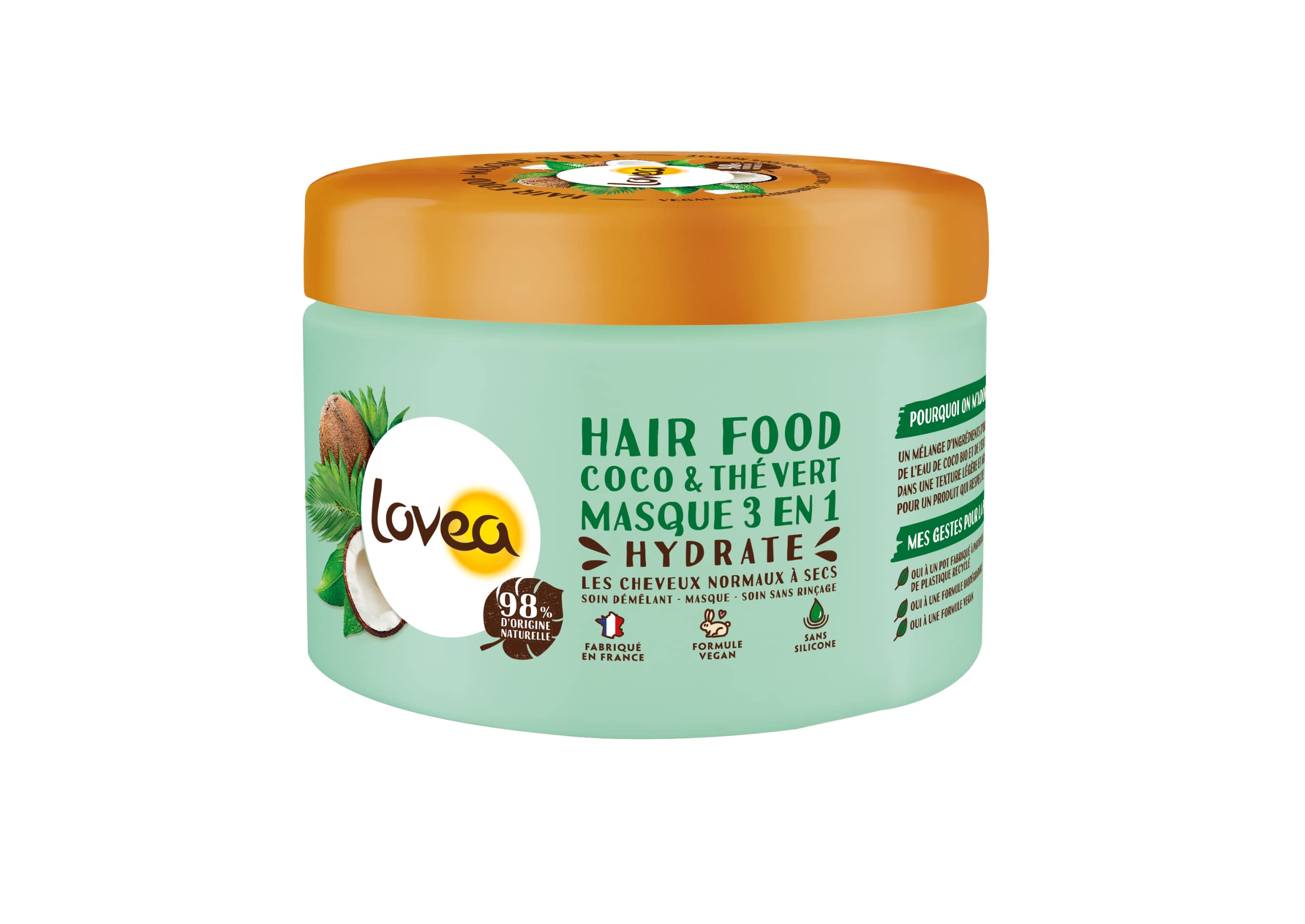 : Developed for all hair types, Lovea's 3-in-1 hair mask moisturizes, softens, and detangles. Thanks to its versatile action, it hydrates and adds shine to hair. Its formula with coconut oil and green tea leaves your hair soft and delicately scented. Vegan, silicone-free, and formulated with 96 naturally derived ingredients, it comes in a recycled and recyclable jar. Dermatologically tested. Directions for use: This hair mask combines 3 actions in 1: As a mask: apply to wet hair. Leave on for 1 minute before rinsing thoroughly. As a leave-in treatment: apply 1 or 2 small amounts to dry or wet hair, without rinsing, to nourish the ends. As a detangler: apply 1 or 2 small amounts to wet hair and rinse before detangling. LOVEA, Naturally Positive Beauty! Since 1994. We want simple, natural, pleasurable, and responsible beauty to care for yourself and the planet. For Natural Beauty: We have chosen clean formulas for our sunscreens, with a high percentage of naturally derived or organic ingredients for our beauty products. For Pleasant Beauty: We offer products with exotic, sensorial, and captivating fragrances, with pleasant textures for all your daily beauty routines. For Responsible Beauty: All our products are made in France and created in the South of France. A majority of our products are vegan and do not contain ingredients of animal origin or derived from animal exploitation. For our packaging, we prioritize alternatives with a limited environmental impact. LOVEA is a brand of the La Phocéenne de Cosmétique group. INGREDIENTS AQUA (WATER) CETEARYL ALCOHOL GLYCERIN DISTEAROYLETHYL DIMONIUM CHLORIDE BRASSICA ALCOHOL COCO-CAPRYLATE CAPRATE COCOS NUCIFERA (COCONUT) FRUIT JUICE CAMELLIA SINENSIS LEAF EXTRACT DIPALMITOYLETHYL DIMONIUM CHLORIDE BRASSICYL VALINATE ESYLATE GUAR HYDROXYPROPYLTRIMONIUM CHLORIDE CALCIUM GLUCONATE PARFUM (FRAGRANCE) SODIUM BENZOATE POTASSIUM SORBATE CITRIC ACID LINALOOL COUMARIN HEXYL CINNAMAL LIMONENE. DIRECTIONS 1. Apply the mask to your hair after shampooing. 2. Leave the mask on for a few minutes. 3. Rinse thoroughly. See moreA FRENCH, NATURAL, PLEASURE RESPONSIBLE BRAND: Lovea offers sun care and beauty products with a high percentage of naturally derived ingredients, made in France and kind to the skin. ECO-DESIGNED PACKAGING: Vegan, silicone-free, and made in France, Lovea hair food comes in a recycled and recyclable jar for a limited environmental impact. COCONUT OIL AND GREEN TEA EXTRACT: The combination of coconut and green tea in a hair mask with an exotic fragrance that hydrates, softens, and adds shine to your hair. 98 NATURALLY DERIVED: This coconut oil and green tea hair mask contains 98 naturally derived ingredients. Formulated without silicone, this hair treatment cares for your hair. A 3-IN-1 HAIR MASK FOR ALL HAIR TYPES: Use as a mask, treatment or detangler, the Lovea hair food mask moisturizes, softens and detangles hair.LOVEA - Hair Food - Masque 3 En 1 - Huile De Coco Thé Vert - Hydrate, Assouplit Démêle - Cheveux Normaux à Secs - 98 D'Origine Naturelle - Sans Silicone - Vegan - Fabriqué En France - 390 mlDESCRIPTION DU PRODUIT DESCRIPTION DU PRODUIT Description produit : Développé pour tous les types de cheveux, le masque capillaire 3 en 1 de Lovea hydrate, assouplit et démêle. Grâce à son action polyvalente, il hydrate et illumine les cheveux. Sa formule à l'huile de coco et au thé vert laisse vos cheveux doux et délicatements parfumés. Vegan, sans silicone, formulé à base de 96 d'ingrédients d'origine naturelle il est proposé dans un pot recyclé et recyclable. Testé sous contrôle dermatologique. Conseils d'utilisation : Ce masque pour les cheveux regroupe 3 actions en 1 : En masque : appliquer sur cheveux mouillés. Laisser poser 1 min avant de rincer abondamment. En soin sans rinçage : appliquer 1 ou 2 noisettes sur cheveux secs ou mouillés, sans rincer, pour nourrir les pointes. En démêlant : appliquer 1 ou 2 noisettes sur cheveux mouillés et rincer avant de démêler. LOVEA, Beauté naturellement positive ! Depuis 1994. Nous voulons une beauté simple, naturelle, plaisir et responsable pour prendre soin de soi et de la planète. Pour une Beauté Naturelle : Nous avons fait le choix de formules Cleans pour nos solaires, avec un fort pourcentage d'ingrédients d'origine naturelle ou Bio pour nos produits de Beauté. Pour une Beauté Plaisir : Nous proposons des produits aux parfums exotiques sensoriels et envoûtants, avec des textures agréables pour tous vos gestes beauté du quotidien. Pour une Beauté Responsable : Tous nos produits sont fabriqués en France et créés dans le sud de la France. Une majorité de nos produits sont Vegan et ne contiennent pas d'ingrédients d'origine animale ni issu de leurs exploitation. Pour nos emballages, nous privilégions les alternatives à l'impact environnemental limité. LOVEA est une marque du groupe La Phocéenne de Cosmétique. INGRÉDIENTS AQUA (WATER) CETEARYL ALCOHOL GLYCERIN DISTEAROYLETHYL DIMONIUM CHLORIDE BRASSICA ALCOHOL COCO-CAPRYLATE CAPRATE COCOS NUCIFERA (COCONUT) FRUIT JUICE CAMELLIA SINENSIS LEAF EXTRACT DIPALMITOYLETHYL DIMONIUM CHLORIDE BRASSICYL VALINATE ESYLATE GUAR HYDROXYPROPYLTRIMONIUM CHLORIDE CALCIUM GLUCONATE PARFUM (FRAGRANCE) SODIUM BENZOATE POTASSIUM SORBATE CITRIC ACID LINALOOL COUMARIN HEXYL CINNAMAL LIMONENE. MODE D'EMPLOI 1. Appliquez le masque sur vos cheveux après le shampooing. 2. Laissez poser le masque pendant quelques minutes. 3. Rincez abondamment. Voir plusUNE MARQUE FRANÇAISE, NATURELLE, PLAISIR RESPONSABLE : Lovea propose des produits solaires et de beauté à fort d'ingrédients d'origine naturelle, fabriqués en France et respectueux de la peau. UN PACKAGING ÉCO-CONÇU : Vegan, sans silicone et fabriqué en France, le hair food lovea est proposé dans un pot recyclé et recyclable pour un impact environnemental limité. HUILE DE COCO ET EXTRAIT DE THÉ VERT : L'alliance de la coco et du thé vert dans un masque pour 
