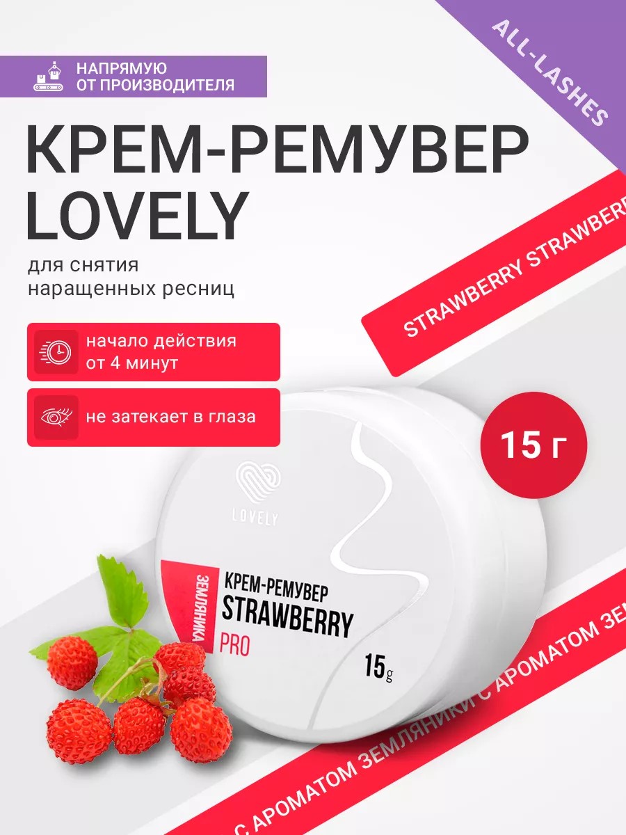 Крем-ремувер Lovely strawberry применяется для эффективного снятия наращенных ресниц. Имеет легкую кремовую консистенцию, благодаря чему препарат не растекается. Ремувер быстро и без комочков растворяет клей. Подходит как для опытных мастеров, так и для начинающих. Полностью безопасен и безвреден, не вызывает аллергии. Способ применения: небольшое количество крем-ремувера нанесите на участки сцепки наращенных и натуральных ресниц с помощью микробраша, оставьте на несколько минут, затем пинцетом снимите наращенные ресницы и тщательно удалите остатки ремувера и клея ватным диском.