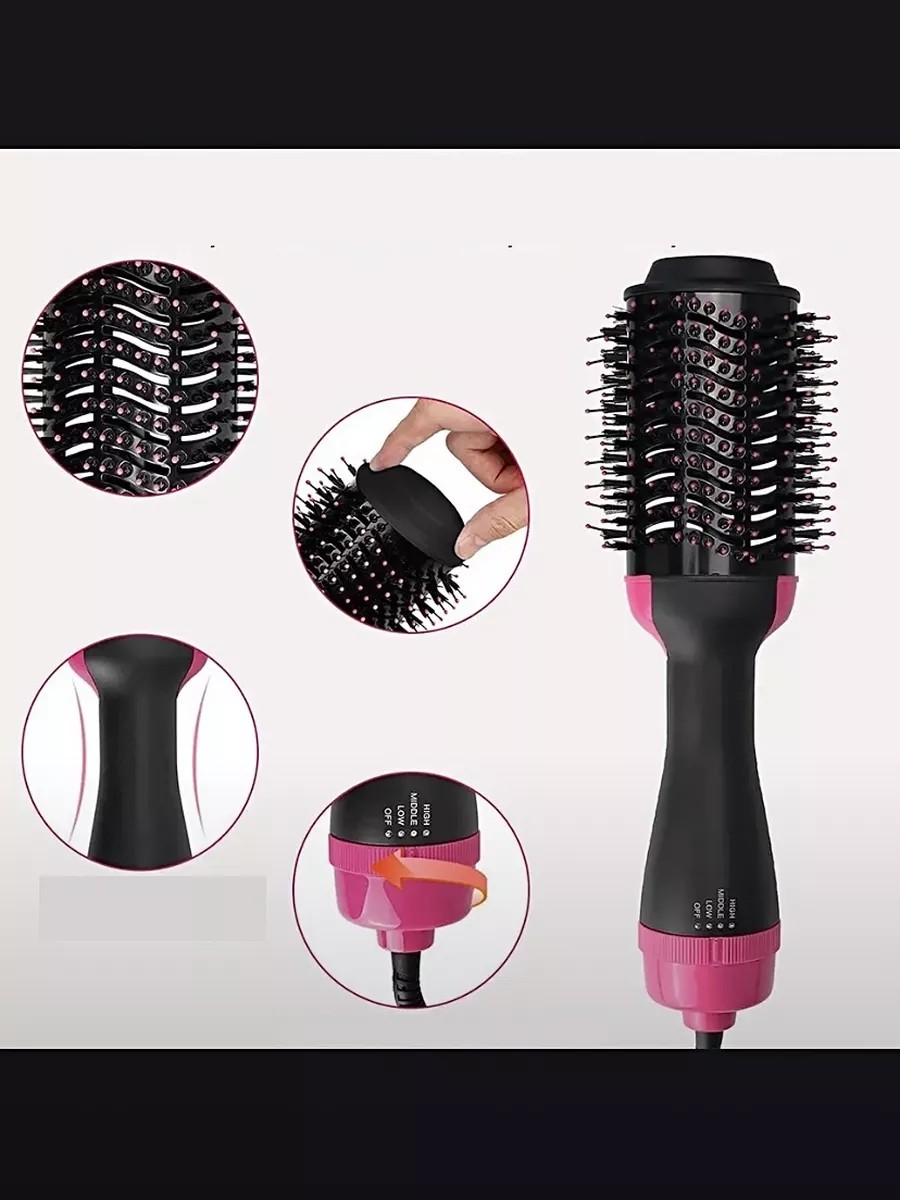 A multifunctional hair dryer and comb with ionization for straightening or curling hair. This 3-in-1 hair dryer and styler is ideal for curling, drying, and brushing. Now you don't need to have three appliances at home: a hair dryer, a styler, and a brush – this hair dryer and brush can do it all. It alone will handle curling and drying your hair, and will create a perfect hairstyle. This hair styler takes up three times less space in your apartment and is convenient to take with you on vacation or business trips. It's an indispensable item for the modern woman. Its fast heat-up and ease of use help save you significant time on styling in the morning. The brush surface is equipped with nylon pins and fuzzy bristles for easy detangling, ideal drying power, and improved volume. Negative ion technology seals the hair cuticle and reduces split ends and frizz, making it ideal for both dry and damp hair. This heated styling brush combines the functions of several tools: an ionic hair dryer, curling iron, tongs, and a brush, making it ideal for use in salons and at home. The dryer's motor is integrated into the heat-resistant handle, ensuring the nozzle is supplied with air from all sides. The oval nozzle is large and well-designed to safely perform any styling or straightening technique, even on thick hair. The nozzle's ceramic base prevents drying out or damaging curls. Each tooth is equipped with a tuft of bristles for added volume, while the rounded tips gently stimulate the scalp. Number of temperature ranges: 3. Number of airflow speeds: 2. Dimensions: 32.5 x 7.5 x 4 cm. The brush itself does not rotate. The straightening and curling comb-brush has nylon bristles. The cord at the base swivels 360 degrees.