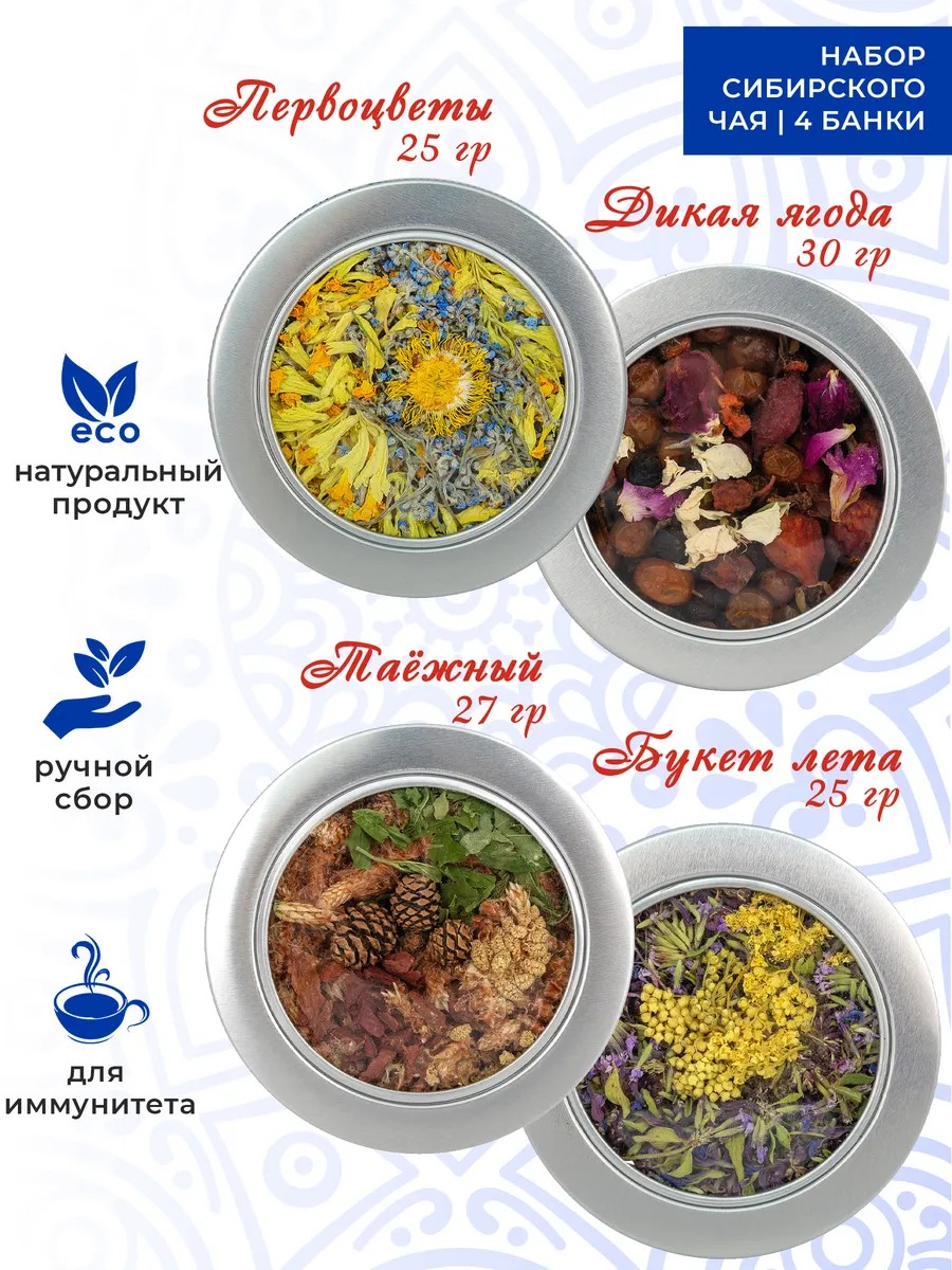 Элитный сибирский чай высшего сорта из премиальной коллекции российского чая – подарочный набор из четырех металлических банок 25 гр. Органический продукт из натуральных трав. Ручной сбор в Сибирской тайге и бережная сушка при низкой температуре сохраняют полезные микроэлементы и витаминный комплекс. СОСТАВ на фото. Купаж Первоцветы. Противопростудный травяной сбор, для лечения горла, легких и от кашля, для иммунитета, диетический, для правильного питания пп. Цветочный чай с мать-и-мачехой, медуницей, первоцветом, баданом, незабудкой.Купаж Дикая ягода. Это богатый букет с плодами, листьями и цветами. Ароматный ягодный напиток с травами и кусочками сушеных ягод и фруктов, в том числе ферментированных (малиной, яблоней, вишней, шиповником, облепихой, боярышником, рябиной и черемухой): это лечебный и тонизирующий чай ручной работы, бодрящий после рабочего дня, с эффектом антистресс. Душистый заварной фиточай для здоровья: противовирусный, имунный, для сердечно-сосудистой системы. Таёжные травы и ягоды - для вашего здоровья. Купаж Таёжный. Заварной травяной напиток с хвоей, шишками и листьями ягод (смородины). Тонкий хвойный аромат. Травяной чай от простуды, для повышения иммунитета.Купаж Букет лета. В составе курильский чай, белоголовник, горная мята. Чай с душицей. Лечебный чай, очищающий (детокс), очищает организм от шлаков и токсинов, для восстановления работы желудочно-кишечного тракта, диетический, для правильного питания пп. Тонкий цветочный и мятный аромат.Это отличная альтернатива таким популярным сортам чая, как ассам, улун, каркаде, пуэр, синий анчан, матча, гречишный, иван-чай. Это не обычный пакетированный чайный напиток, а богатый купаж для заваривания и подачи в сервизах и хрустале. Травяной сбор без гмо, консервантов, кофеина, красителей. Тонкий цветочно-ягодный аромат для изысканных чайных церемоний. Для заваривания в чайнике и подачи в пиалах и чашках. Подарочный чай для мужчин и женщин. Можно преподнести маме, подруге, бабушке, сестре, папе, мужу, жене, коллеге на день Святого Валентина, день рождения, 23 февраля, 8 марта, новый год.