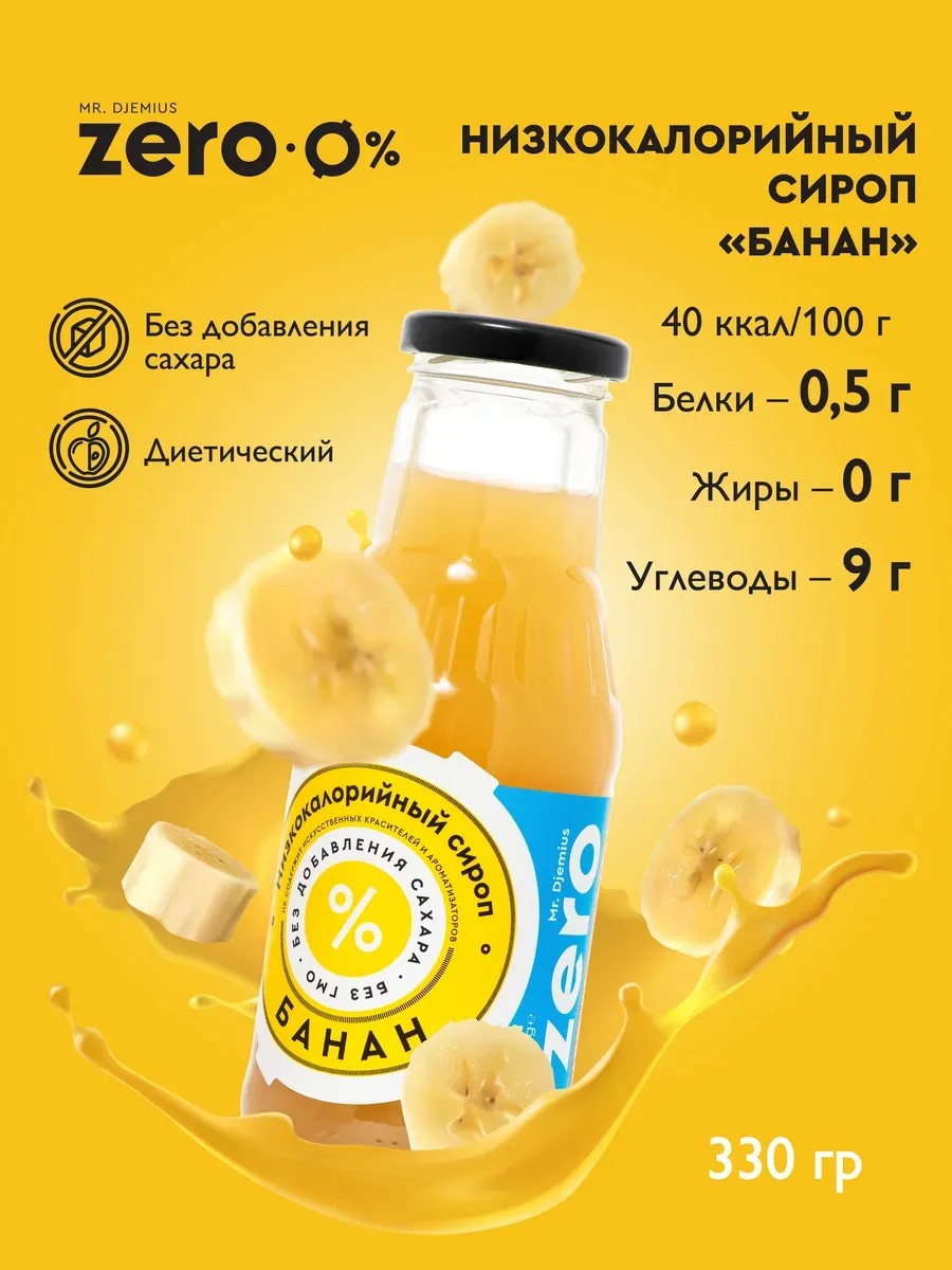 Mr. Djemius ZERO Banana, a low-calorie, sugar-free syrup, has the rich tropical flavor of ripe banana and is the perfect dressing for fruit salads. Just a few spoons of sugar-free banana syrup combined with soda are needed to create a refreshing summer lemonade or to add exquisite notes of coffee and cocoa! The topping is completely sugar-free and calorie-free, which is sure to please those with a sweet tooth, those on a diet, or those following a healthy diet. Contains sweeteners. May have a laxative effect if consumed in excess. A natural sediment may form. Shake before use. Contraindications: individual intolerance to the product ingredients. Store at a temperature of 0 to 25 °C and a relative humidity of no more than 75%. After opening, store in the refrigerator at +(4±2)⁰ C. Shelf life after opening is 14 days. Healthy sweets, healthy treats, healthy sweets, banana syrup. A great gift for parents, colleagues, and friends.