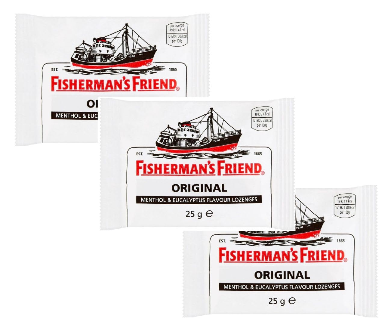 Fishermans Friend Original Extra Strong Lozenges in 0.88oz (25g) pack. 1 pack contains 20 Lozenges. Menthol cough suppressant lozenges. Original extra strong lozenges are very effective at providing temporary relief of coughs and nasal congestion due to colds, flu, and allergies, or to inhaled irritants. Fishermans Friend Original Extra Strong lozenges are an all natural product with no artificial ingredients or preservatives. The product is gluten-free, contains no genetically modified organisms, and is fat and cholesterol free. Product of United Kingdom.