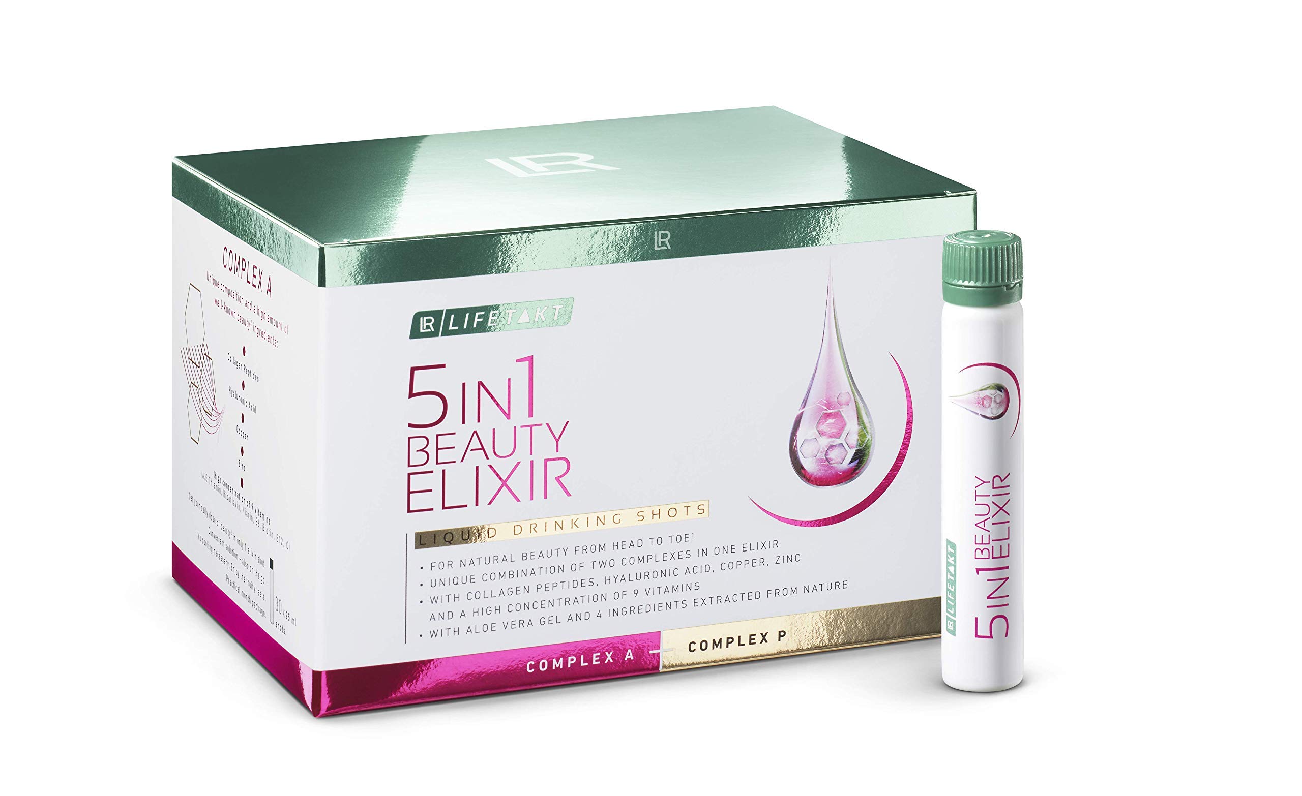 Drink you! The revolutionary LR Life Akt 5in1 Beauty Elixir meets all 5 beauty wishes at once! With just one shot every day, a unique double complex activates deeply The beauty processes in the body and protects preventively from the main causes aging - for teenagers beauty from head to toe at all ages. Reduction by vitamin C1 and deep-effective collagen peptides 15 more skin elasticity through effective collagen peptides Aloe vera-gel, blood orange, rose root and green tea extract protect against the main causes of aging, such as:B. UV radiation Protection against external environmental influences by blueberry extract and vitamin E5 Improved skin function and pigmentation with the highly concentrated vitamins A, riboflavin, niacin, biotin, C and zinc as an essential trace element Collagen peptides increase the skin density and demonstrably reduce cellulite Copper and aloe vera-gel strengthen the connective tissue Biotin strengthens the hair and builds it on the inside of copper ensures normal hair pigmentation and gives healthy shine Collagen peptides demonstrably accelerate nail growth.Nail damage is reduced by up to 42 Zinc strengthens the nails Unique on the market: Double complex The active complex activates the beauty processes and combats signs of aging. Recommended consumption: A drinking campaign every day. Please shake before use. Hints: The recommended daily dose should not be exceeded. Dietary supplements are not a substitute for a varied and balanced diet and a healthy lifestyle. Keep the product outside the range of small children. Contains caffeine. For children and pregnant women, not recommended caffeine content 0.8 mg 25 ml. Ingredients ingredients Water, aloe vera (barbatensis miller) gel, agave juice, white grape juice concentrate, orange juice concentrate, pear juice concentrate, apricot juice concentrate, acidic acid), magnesium carbonate, aroma, l-ascorbic acid, hyaluronic acid (potassium sorbate), thickening Nicotinamid, DL-a-tocopheryl acetate, retinylpalmitat, rosewurz extract, zinc gluconate, blood orange extract, blueberry extract, green tea extract, citrus bioflavonoids, copper gluconate, mango sulfate, pyridoxinhydrochloride, riboflavin Cyanocobalamin.without sweetener, artificial dyes, lactose or gluten.Looks active and preventive.Unique beauty elixir with a double complex.Monthly pack contains 30 x 25 ml beauty shot.TRINK DICH SCHÖN! Das revolutionäre LR LIFETAKT 5in1 Beauty Elixir erfüllt alle 5 Beauty-Wünsche auf einmal! Mit nur einem Shot täglich aktiviert ein einzigartiger Doppel-Komplex tiefenwirksam die Beauty-Prozesse im Körper und schützt präventiv vor den Hauptursachen der Alterung – für jugendliche Schönheit von Kopf bis Fuß in jedem Alter. Faltenreduktion durch Vitamin C1 und tiefenwirksame Kollagen-Peptide 15 mehr Hautelastizität durch effektive Kollagen-Peptide Aloe Vera-Gel, Blutorangen-, Rosenwurz- und Grüntee-Extrakt schützen vor den Hauptursachen der Alterung, wie z. B. UV-Strahlung Schutz vor externen Umwelteinflüssen durch Blaubeer- Extrakt und Vitamin E5 Verbesserte Hautfunktion und -pigmentierung mit den hoch-konzentrierten Vitaminen A, Riboflavin, Niacin, Biotin, C sowie Zink als essenzielles Spurenelement Kollagen-Peptide steigern die Hautdichte und reduzieren Cellulite nachweislich Kupfer und Aloe Vera-Gel stärken das Bindegewebe Biotin stärkt die Haare und baut sie von innen auf Kupfer sorgt für eine normale Haarpigmentierung und verleiht gesunden Glanz Kollagen-Peptide beschleunigen das Nagelwachstum nachweislich. Nagelschäden werden um bis zu 42 reduziert Zink stärkt die Nägel Einzigartig auf dem Markt: DOPPEL-KOMPLEX Der Aktiv-Komplex aktiviert die Beauty-Prozesse und bekämpft Alterserscheinungen. Verzehrempfehlung: Eine Trinkampulle täglich. Bitte vor Gebrauch schütteln. Hinweise: Die empfohlene tägliche Verzehrmenge darf nicht überschritten werden. Nahrungsergänzungsmittel sind kein Ersatz für eine abwechslungsreiche und ausgewogene Ernährung und eine gesunde Lebensweise. Produkt außerhalb der Reichweite von kleinen Kindern aufbewahren. Enthält Koffein. Für Kinder und schwangere Frauen nicht empfohlen Koffeingehalt 0,8 mg je 25 ml. INHALTSSTOFFE ZUTATEN Wasser, Aloe Vera (Barbadensis Miller) Gel, Agavendicksaft, weißes Traubensaftkonzentrat, Orangensaftkonzentrat, Birnensaftkonzentrat, Aprikosensaftkonzentrat, Säuerungsmittel (Citronensäure), Magnesiumcarbonat, Aroma, L-Ascorbinsäure, Hyaluronsäure, Konservierungsstoff (Kaliumsorbat), Verdickungsmittel (Xanthan), Nicotinamid, DL-a-Tocopherylacetat, Retinylpalmitat, Rosenwurzextrakt, Zinkgluconat, Blutorangenextrakt, Blaubeerextrakt, Grünteeextrakt, Citrus Bioflavonoide, Kupfergluconat, Mangansulfat, Pyridoxinhydrochlorid, Riboflavin, Thiaminhydrochlorid, D-Biotin, Cyanocobalamin.Ohne Süßungsmittel, künstliche Farbstoffe, Laktose oder Gluten. Wirkt aktiv und präventiv. Einzigartiges Schönheits-Elixier mit Doppelkomplex. Monatspackung enthält 30 x 25 ml Beauty Shot.LR 5in1 Beauty Elixir für jugendliches Aussehen, reine Haut, straffer Körper, kraftvolles Haar und starke Nägel 30x25ml