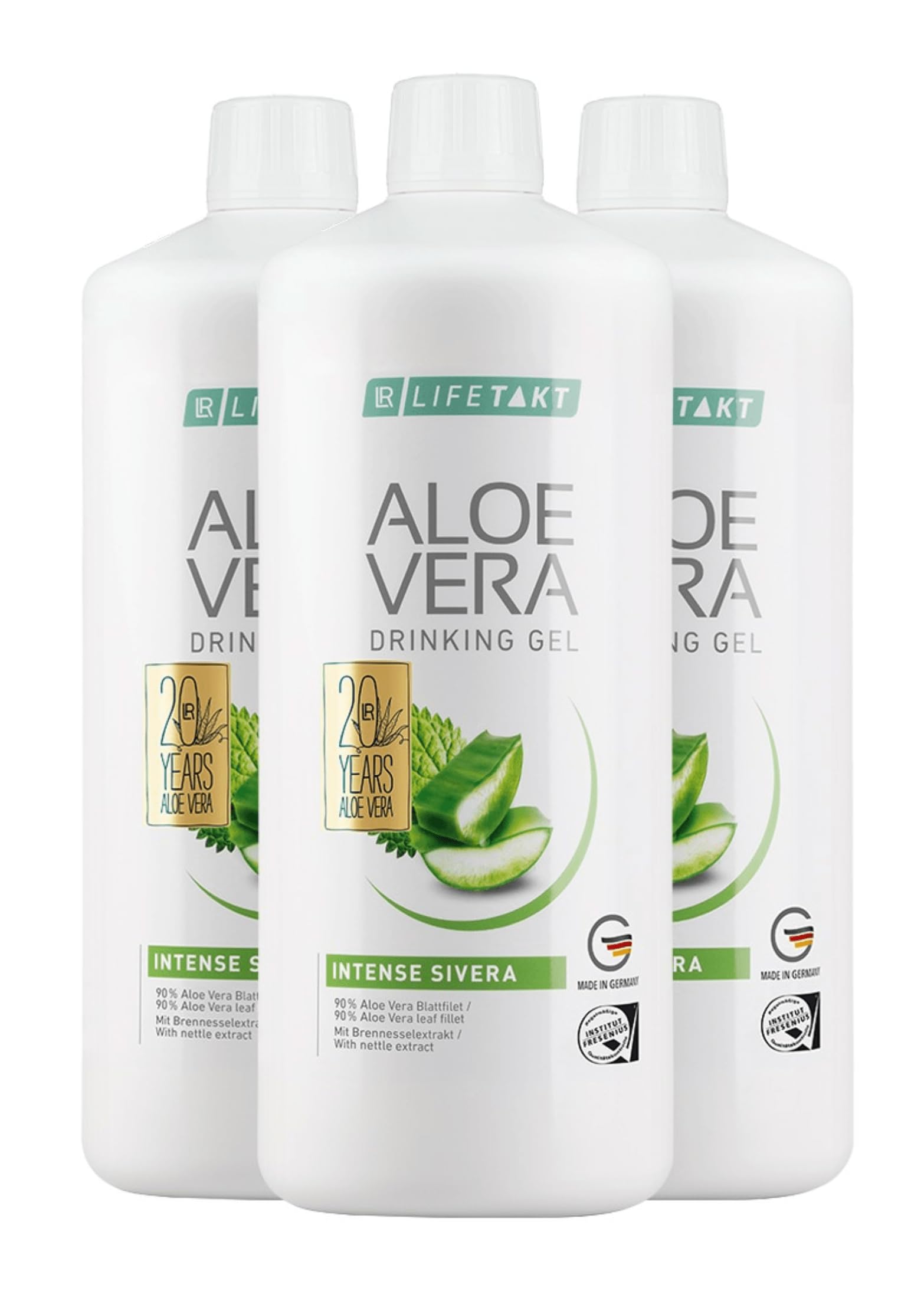 Pack of 3 Sivera Intense Aloe Vera Drinking Gels - A true specialist for your well-being: Sivera Intense Drinking Gel with nettle extract and real honey - Sivera Intense Drinking Gel combines the beneficial properties of aloe vera with nettle extract. Scientific research is the basis for innovative product concepts. That's why LR invests considerable time and money to always be at the forefront of science and research. Sivera Intense Aloe Vera Drinking Gel is just one example of how LR combines valuable natural ingredients to create top-quality products for you. INGREDIENTS Aloe Vera Barbadensis Miller Gel (USA Mexico, 90 ), Flower Honey (7 ), Nettle Extract (2 ), Acidifier (citric acid), Stabilizer (xanthan gum), Antioxidant (L-ascorbic acid), Preservative (potassium sorbate). DISCLAIMER All information on this page is provided for informational purposes only and is not a substitute for medical or pharmaceutical advice from a doctor or pharmacist. The and usage recommendations are based on the respective manufacturer's instructions. We do not guarantee the accuracy of this information. Please read all product instructions carefully and contact the manufacturer, a doctor, or your pharmacist if you have any questions. See more