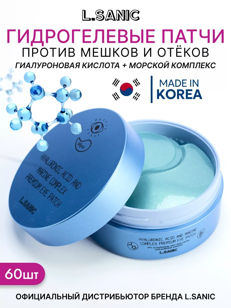 Патчи гидрогелевые с ниацинамидом, гиалуроновой кислотой и экстрактами морских водорослей для области вокруг глаз, Корея. Количество - 60 штук. L.SANIC Hyaluronic Acid And Marine Complex Premium Eye Patch, 60pcs. Увлажняющие патчи с гелевой текстурой пропитаны высококонцентрированной сывороткой, быстро снимающей отечность и устраняющей темные круги под глазами. Гиалуроновая кислота обеспечивает увлажнение чувствительной зоне вокруг глаз, возвращая коже природную гладкость и упругость. Специальный комплекс из экстрактов морских водорослей снимает отечность и наполняет эпидермис энергией. В составе увлажняющих патчей содержится ниацинамид, стимулирующий кровообращение, возвращающий коже здоровый тон и убирающий темные круги. Подходит для всех типов кожи, в том числе и для проблемной. Применение: лопаточкой достать гидрогелевые патчи из упаковки, разместить у зоны вокруг глаз острым кончиком к переносице, добиться плотного прилегания. Снять через 20 - 30 минут и похлопывающими движениями распределить эссенцию до впитывания. Используйте утром для ярко выраженного увлажняющего и подтягивающего эффекта. Корейские патчи увлажняющие станут отличным подарком женщине - маме, подруге, девушке на день рождения, новый год, 8 марта, день Святого Валентина. Рекомендуются к использованию в комплексе с серией корейской косметики для ухода за лицом и телом L.Sanic.