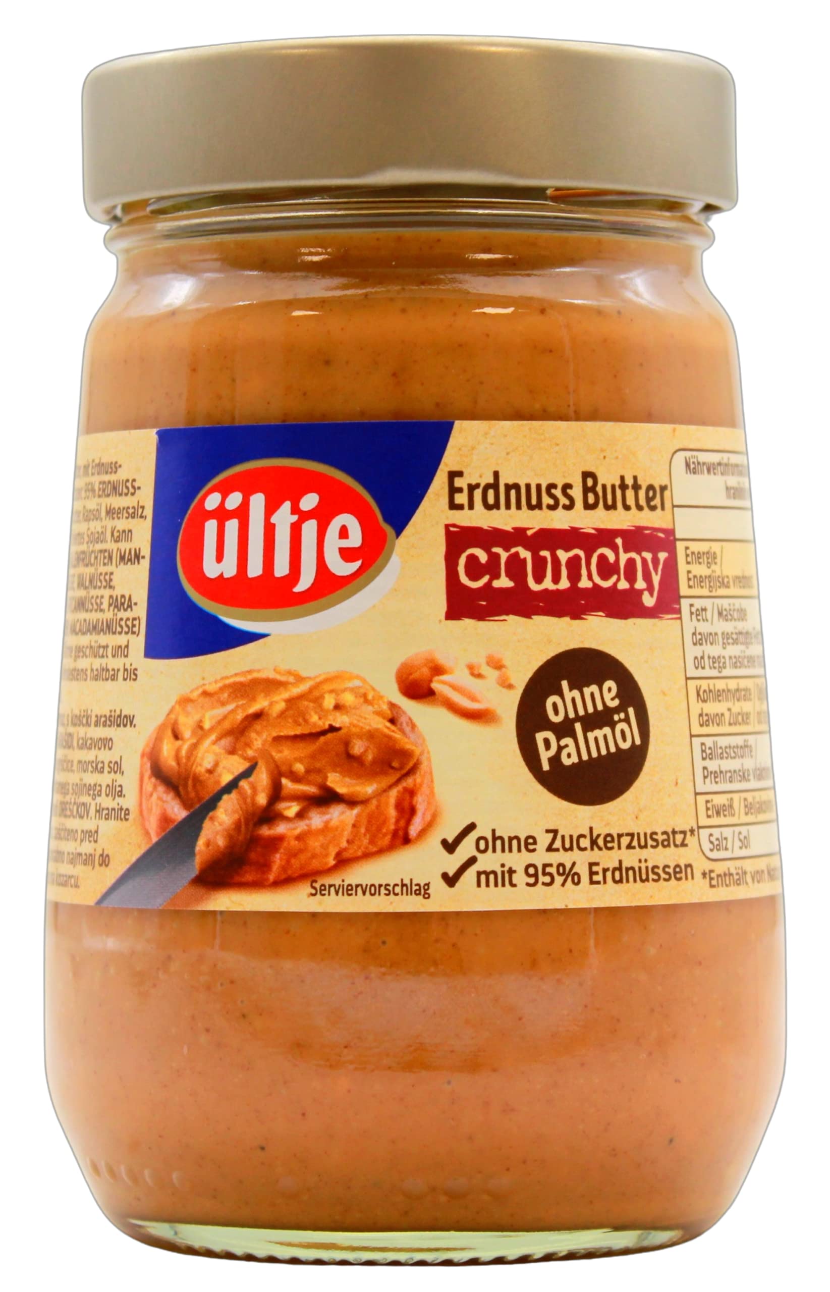 fiber in G9.1 protein in G25 salt in G0.33.Gluten -free according to VO (EC) No. 41/2009.Contained allergens: peanuts and products made from them;Soybeans and products made from it.Can traces of: shell fruits, d.H.Almonds, various nuts, pistachios and products made from it;Almonds (Amygdalus Communis L.) as well as products made from it;Hazelnuts (Corylus Avellana) as well as products made from it;Walnuts (Juglans Regia) as well as products made from it;Casch humans (Anacardium Occidentale) as well as products made from it;Pecanuts (Carya Illinoinensis (Wangenh.) K. Koch) as well as products made from it;Paranese (Bertholletia Excelsa) as well as products made from it;Pistachios (Pistacia Vera) as well as products made from it;Macadamia or queensland nuts (Macadamia Ternifolia) as well as products obtained from it. Ingredients / ingredients Ingredients: 95% peanut nuclei, cocoa butter, rapeseed oil, sea salt, fully sophisticated soybean oil.Can contain traces of shell fruits (almonds, hazelnuts, walnuts, cashew nuts, pecans, paranese, pistachios, macadamia nuts). Instructions Ready for consumption Address manufacturer/importer Erna-Scheffler-Str.3, DE-51103 Cologne More for breakfast, cooking and baking.With extra crunchy covered coats.Peanut butter with 92 percent peanuts. Erdnussbutter, mit Erdnuss-Stückchen. Durchschnittliche Nährwerte je 100 g Brennwert in kJ2492 Brennwert in kcal601 Fett in g47 Fett, davon gesättigte Fettsäuren in g7,8 Fett, davon einfach ungesättigte Fettsäuren in g36 Fett, davon mehrfach ungesättigte Fettsäuren in g2,9 Kohlenhydrate in g15 Kohlenhydrate, davon Zucker in g5,9 Ballaststoffe in g9,1 Eiweiß in g25 Salz in g0,33. Glutenfrei gem. VO (EG) Nr. 41/2009. Enthaltene Allergene: Erdnüsse und daraus hergestellte Erzeugnisse; Sojabohnen und daraus hergestellte Erzeugnisse. Kann Spuren von: Schalenfrüchte, d. h. Mandeln, div. Nüsse, Pistazien und daraus hergestellte Erzeugnisse; Mandeln (Amygdalus communis L.) sowie daraus hergestellte Erzeugnisse; Haselnüsse (Corylus avellana) sowie daraus hergestellte Erzeugnisse; Walnüsse (Juglans regia) sowie daraus hergestellte Erzeugnisse; Kaschunüsse (Anacardium occidentale) sowie daraus hergestellte Erzeugnisse; Pecannüsse (Carya illinoinensis (Wangenh.) K. Koch) sowie daraus hergestellte Erzeugnisse; Paranüsse (Bertholletia excelsa) sowie daraus hergestellte Erzeugnisse; Pistazien (Pistacia vera) sowie daraus hergestellte Erzeugnisse; Macadamia- oder Queenslandnüsse (Macadamia ternifolia) sowie daraus gewonnene Erzeugnisse enthalten. INHALTSSTOFFE / ZUTATEN Zutaten: 95% ERDNUSSKERNE, Kakaobutter, Rapsöl, Meersalz, vollständig raffiniertes Sojaöl. Kann Spuren von SCHALENFRÜCHTEN (MANDELN, HASELNÜSSE, WALNÜSSE, CASHEWNÜSSE, PECANNÜSSE, PARANÜSSE, PISTAZIEN, MACADAMIANÜSSE) enthalten. GEBRAUCHSANWEISUNG Verzehrfertig ANSCHRIFT HERSTELLER/IMPORTEUR Erna-Scheffler-Str. 3, DE-51103 Köln MehrFür das Frühstück, zum Kochen und Backen. Mit extra knackigen Erdnüssstückchen. Erdnussbutter mit 92 Prozent Erdnüssen.