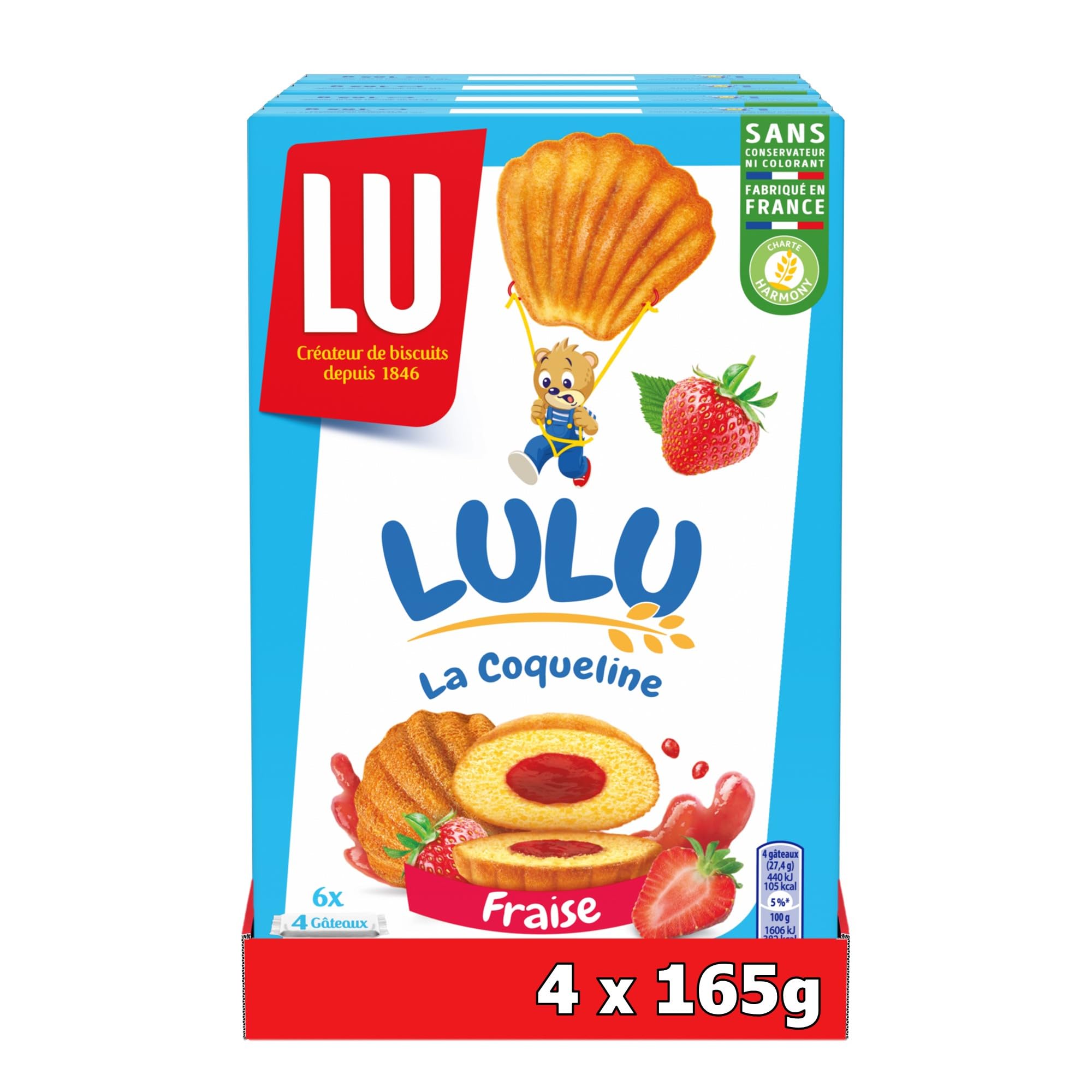 DELIVERY CONTENTS - This box contains 4 boxes of soft Lulu La Coqueline cakes filled with strawberry, i.e. a batch of 4 x 165g. LU HARMONY CHARTER - Good wheat for good cakes: carefully selected wheat, close to our biscuit factory, more respectful of the environment and in partnership with farmers. GOURMET BREAK - Ideal for children's snacks, small appetites at any time of the day or to share with friends during a coffee break. PRACTICAL FORMAT - Lulu La Coqueline cakes accompany your children throughout the day for a gourmet break with their pocket formats, practical to take away thanks to their individual packaging. LULU LA COQUELINE STRAWBERRY - Discover Lulu La Coqueline strawberry, a delicious soft cake filled with strawberry.CONTENU DE LA LIVRAISON - Ce carton contient 4 boîtes de gâteaux moelleux Lulu La Coqueline fourrés à la fraise soit un lot de 4 x 165g. CHARTE LU HARMONY - Du bon blé pour de bons gâteaux : blé soigneusement sélectionné, proche de notre biscuiterie, plus respectueux de l'environnement et en partenariat avec les agriculteurs. PAUSE GOURMANDE - Idéal pour le goûter des enfants, les petites faims à n'importe quel moment de la journée ou encore à partager entre amis lors d'une pause café. FORMAT PRATIQUE - Les gâteaux Lulu La Coqueline accompagnent vos enfants tout au long de la journée pour une pause gourmande avec leurs formats de poche pratiques à emporter grâce à leurs emballages individuels. LULU LA COQUELINE FRAISE - Découvrez Lulu La Coqueline fraise, un délicieux gâteau moelleux fourré à la fraise.