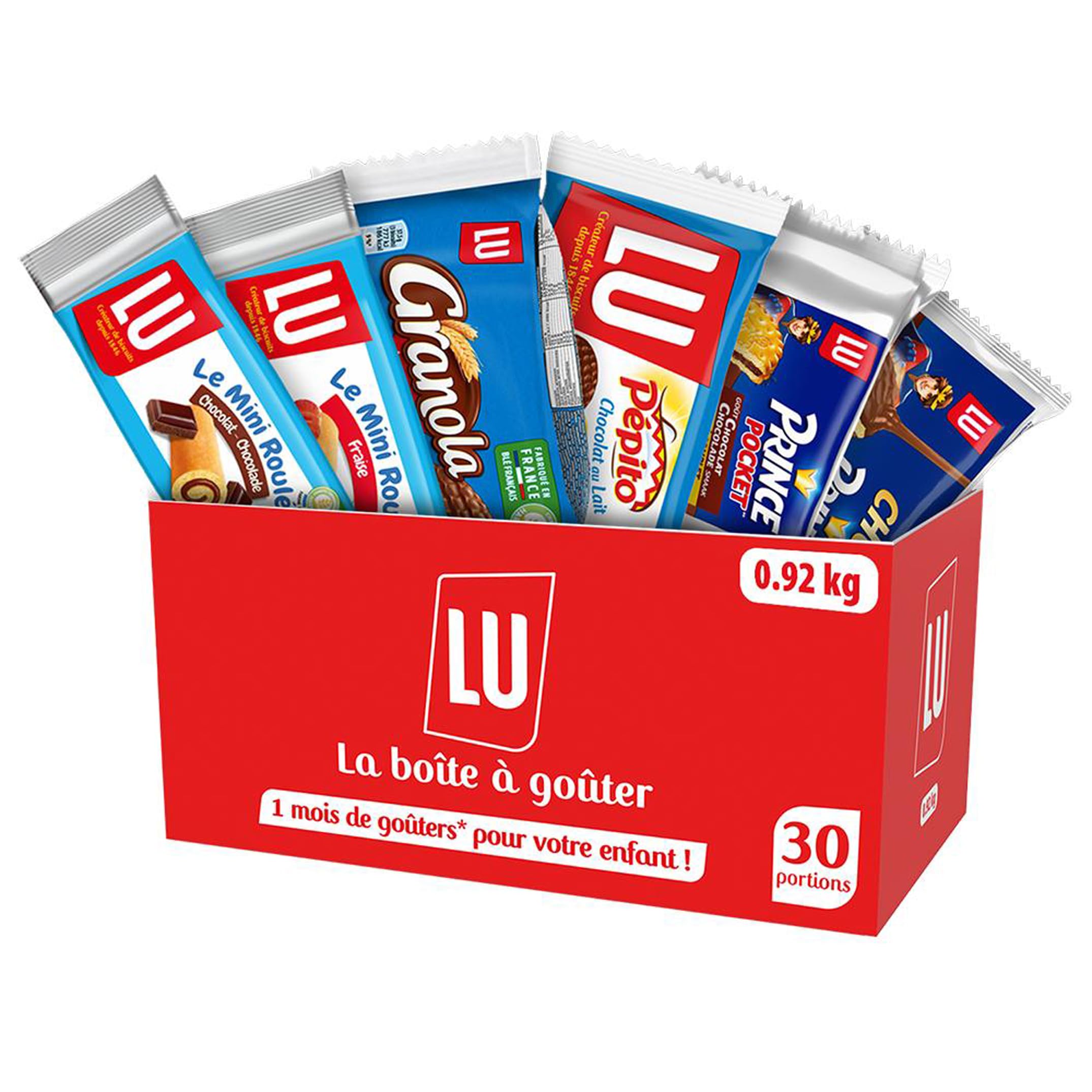 The Snack Box is: a large format ideal for families combining practicality and pleasure. For your child: the possibility of varying snacks according to their desires. For you: the comfort of having approximately 1 month of snacks available for your child (30 portions). The box contains: 6 Prince Pocket and 4 Choco Prince, 6 Pépito Milk Chocolate, 6 Granola L'Original milk chocolate, 4 Mini Strawberry Roll and 4 Mini Chocolate Roll. In short, the best of LU for your child's playtimes, outings and vacations!8 MINI ROLLS - A delicious recipe combining a soft and melting sponge cake with the subtlety and delicacy of strawberry (x 4) or chocolate (x 4). 6 GRANOLA THE ORIGINAL - The inimitable Granola taste, a biscuit with a shortbread texture, rich in wheat and topped with delicious melting milk chocolate. 6 PÉPITO MILK CHOCOLATE - A delicious biscuit topped with milk chocolate for a completely CHOCO snack, made in France in Cestas. 6 PRINCE POCKET and 4 CHOCO PRINCE - Delicious biscuits with a good chocolate taste, rich in cereals and sources of fiber. Prince is suitable for children's snacks. It's the ideal companion for gourmet breaks!. THE LU SNACK BOX - Find all the best of LU, in a sharing format of 30 individual portions, that your children will love, 30 individual portions ( equivalent to 30 individual portions). La Boîte à Goûter, c'est : un grand format idéal pour les familles alliant praticité et plaisir. Pour votre enfant : la possibilité de varier les goûters en fonction de leurs envies. Pour vous : le confort d'avoir environ 1 mois de goûters à disposition pour votre enfant (30 portions). La boîte contient : 6 Prince Pocket et 4 Choco Prince, 6 Pépito Chocolat au Lait, 6 Granola L'Original au chocolat au lait, 4 Mini Roulé Fraise et 4 Mini Roulé Chocolat. Bref, le meilleur de LU pour les récréations, sorties et vacances de votre enfant !8 MINI ROULÉ - Une délicieuse recette alliant une génoise moelleuse et fondante à la subtilité et à la délicatesse de la fraise (x 4) ou du chocolat (x 4). 6 GRANOLA L'ORIGINAL - L'inimitable goût Granola, un biscuit avec une texture sablée, riche en blé et nappé au bon chocolat au lait fondant. 6 PÉPITO CHOCOLAT AU LAIT - Un délicieux biscuit nappé de chocolat au lait pour un goûter complètement CHOCO, fabriqué en France à Cestas. 6 PRINCE POCKET et 4 CHOCO PRINCE - De délicieux biscuits au bon goût de chocolat, riches en céréales et sources de fibres. Prince est adapté au goûter des enfants. C'est le compagnon idéal des pauses gourmandes !. LA BOITE A GOUTER LU - Retrouvez tout le meilleur de LU, dans un format à partager de 30 portions individuelles, que vos enfants vont adorer, 30 portions individuelles ( équivaut à 30 portions individuelles).