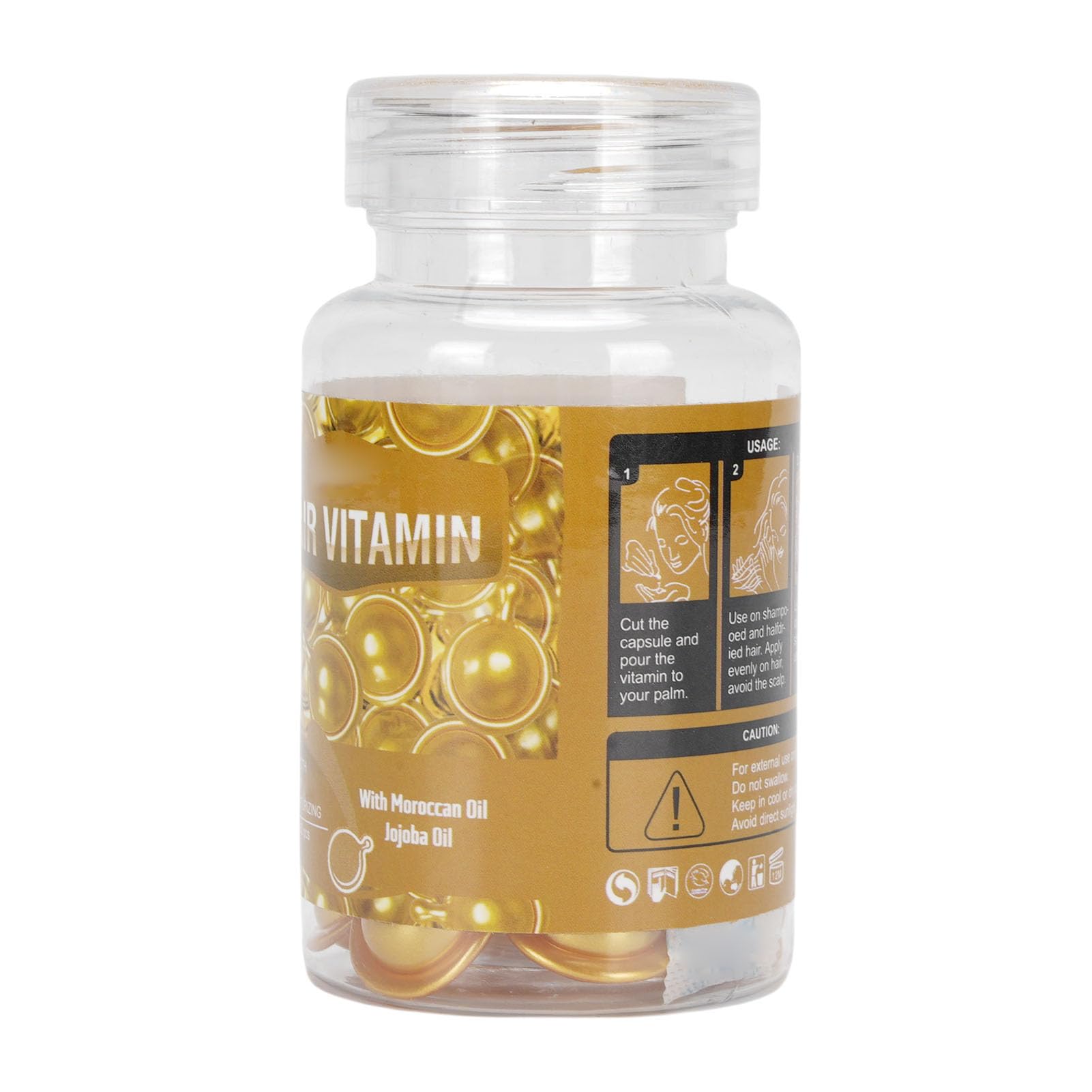 [Safe]: Free from harmful substances for gentle hair and skin care. [Improves Hair Softness]: Retains moisture and increases shine for soft, silky locks. [Hydrates and Nourishes]: Targets dry and frizzy hair with safe and gentle ingredients. [Increases Elasticity]: Repairs and restores hair, leaving it radiant and vibrant. [Maintains Color Vibrant]: Ideal for dull or sun-damaged locks, leaving hair soft and manageable. Specifications: Item Type: Hair Capsules Texture: Liquid Quantity: 30 units Shelf Life: 3 years Color: Gold Package List: 30 x Hair Capsules 1 x Storage Bottle Directions for Use: 1. Open the capsule and pour the liquid into the palm of your hand. 2. Apply to damp hair, avoiding the scalp. 3. Keep hair dry, do not rinse, and style as usual. SAFETY WARNING: For external use only. Avoid contact with eyes. Keep away from flames or heat sources.