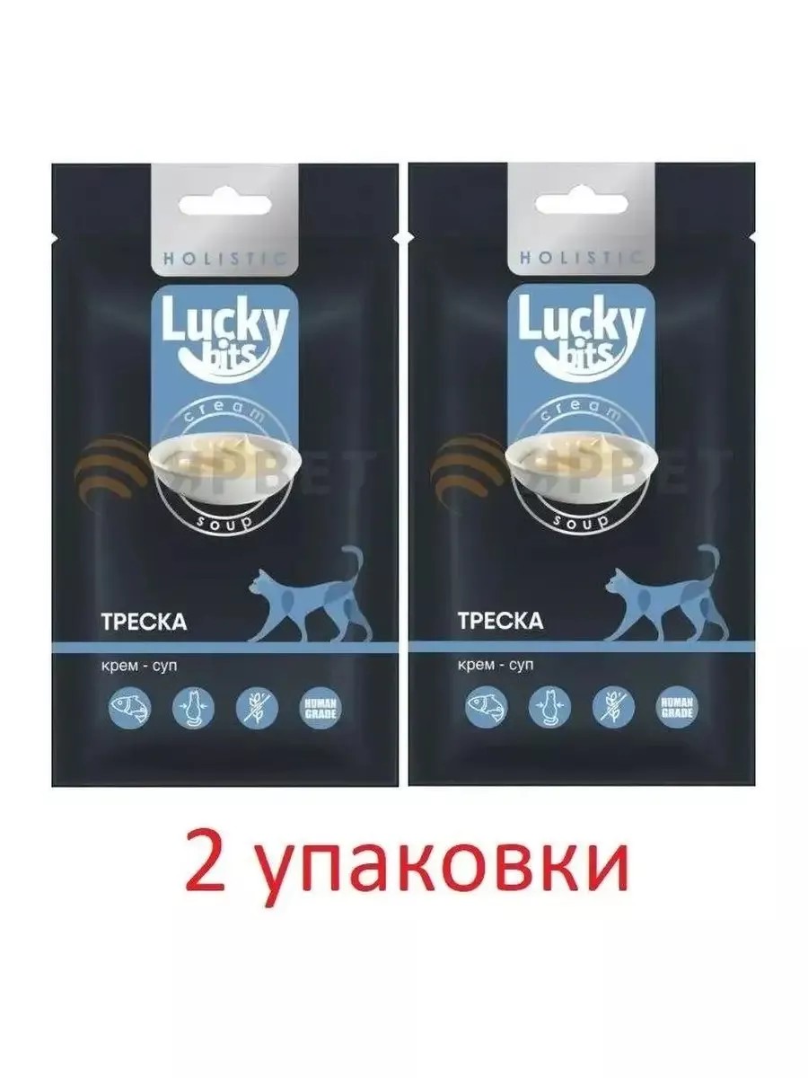 | Комплектация | Лакомство для кошек Lucky bits крем суп из филе трески, 2 упаковки 5х20 г |