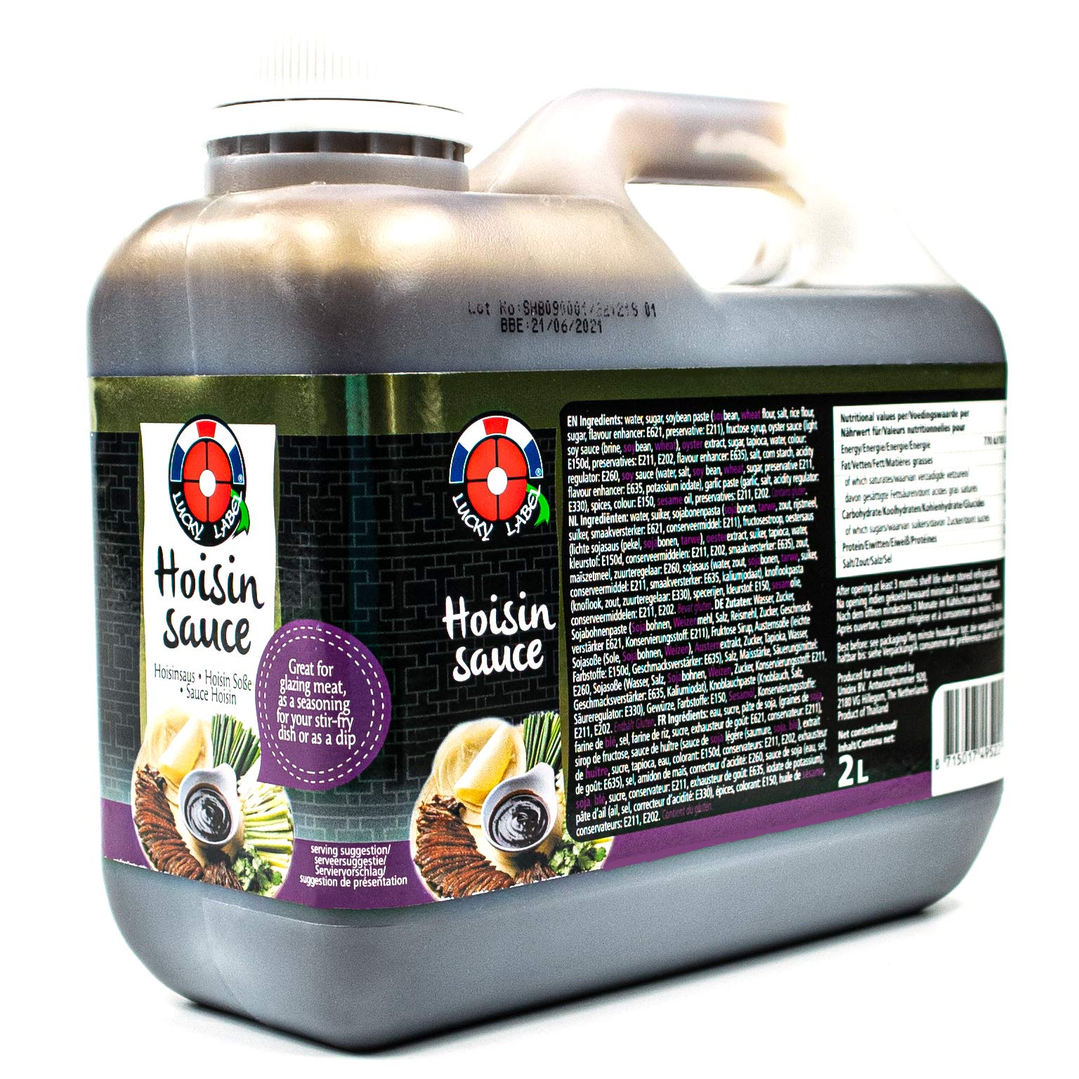 Lucky Label Hoisin Sauce – 2-liter bottle. INGREDIENTS Water, sugar, soybean paste, wheat flour, salt, rice flour, sugar, flavoring (E621), preservative (E211), fructose syrup, oyster sauce, light soybeans, soybeans, oyster extract, tapioca, color (E150d), flavoring (E635), salt, corn starch, acidifier (E260), soy sauce, soybeans, wheat, preservative (E211), flavoring (E635), potassium iodate, garlic paste, acidity regulator (E330), spices, color (E150), sesame oil, preservatives (E211, E202).