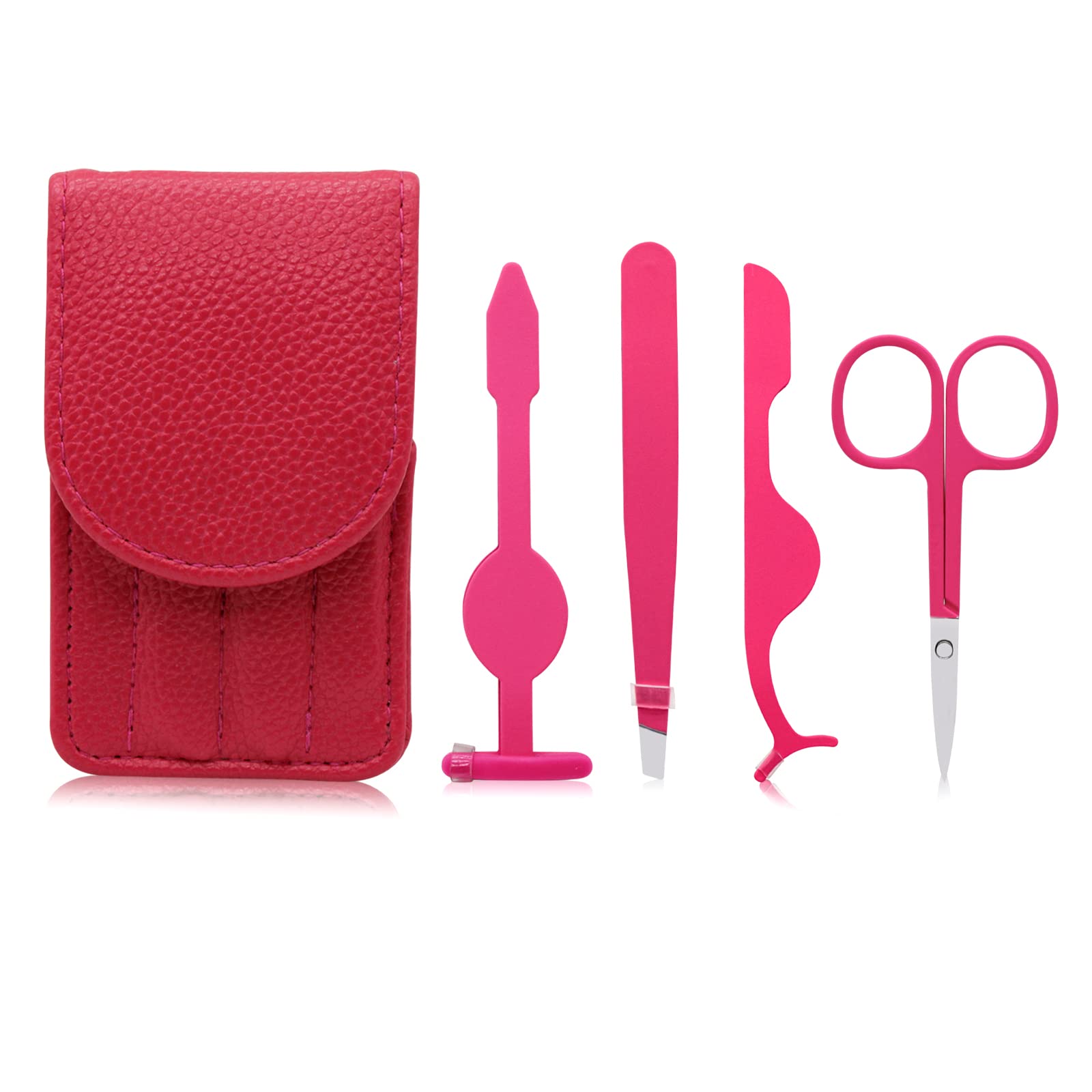 LuckyOpt False Eyelashes Applicator 4Pcs Set Lashes Cosmetic Tool with Storage Leather Case Eyebrow Tweezers & Scissor Set for Trimming Eyebrow Pasting Fake Eyelashes& Double Eyelid Patch (pink)
