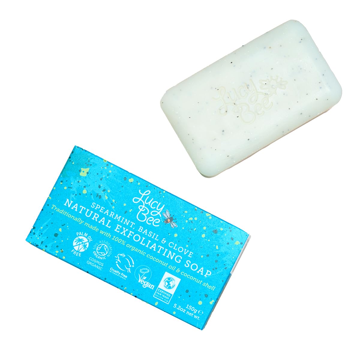 Lucy Bee Spearmint Basil & Clove Natural Exfoliating Soap Bar For Hands & Body Palm Oil Free Certified Organic Fair Trade Vegan Cruelty Free Ethical Best Buy 150g
