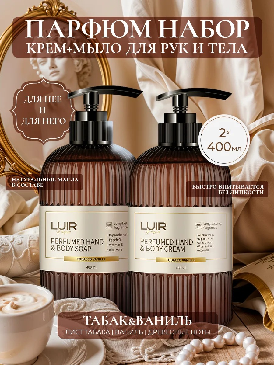 Набор крем для рук + жидкое мыло Luir от НПК Медэкс с ароматом Табак ваниль — это роскошный уход для ваших рук и тела. Крем имеет легкую текстуру, которая быстро впитывается в кожу, оставляя ее мягкой и увлажненной. Мыло по мотивам Том Форд Tobacco Vanille от Luir - это роскошный продукт, который порадует вас не только превосходным качеством ухода за кожей, но и изысканным ароматом. Это жидкое мыло - идеальный выбор для тех, кто ценит качественный уход за телом и любит окружать себя красивыми вещами.