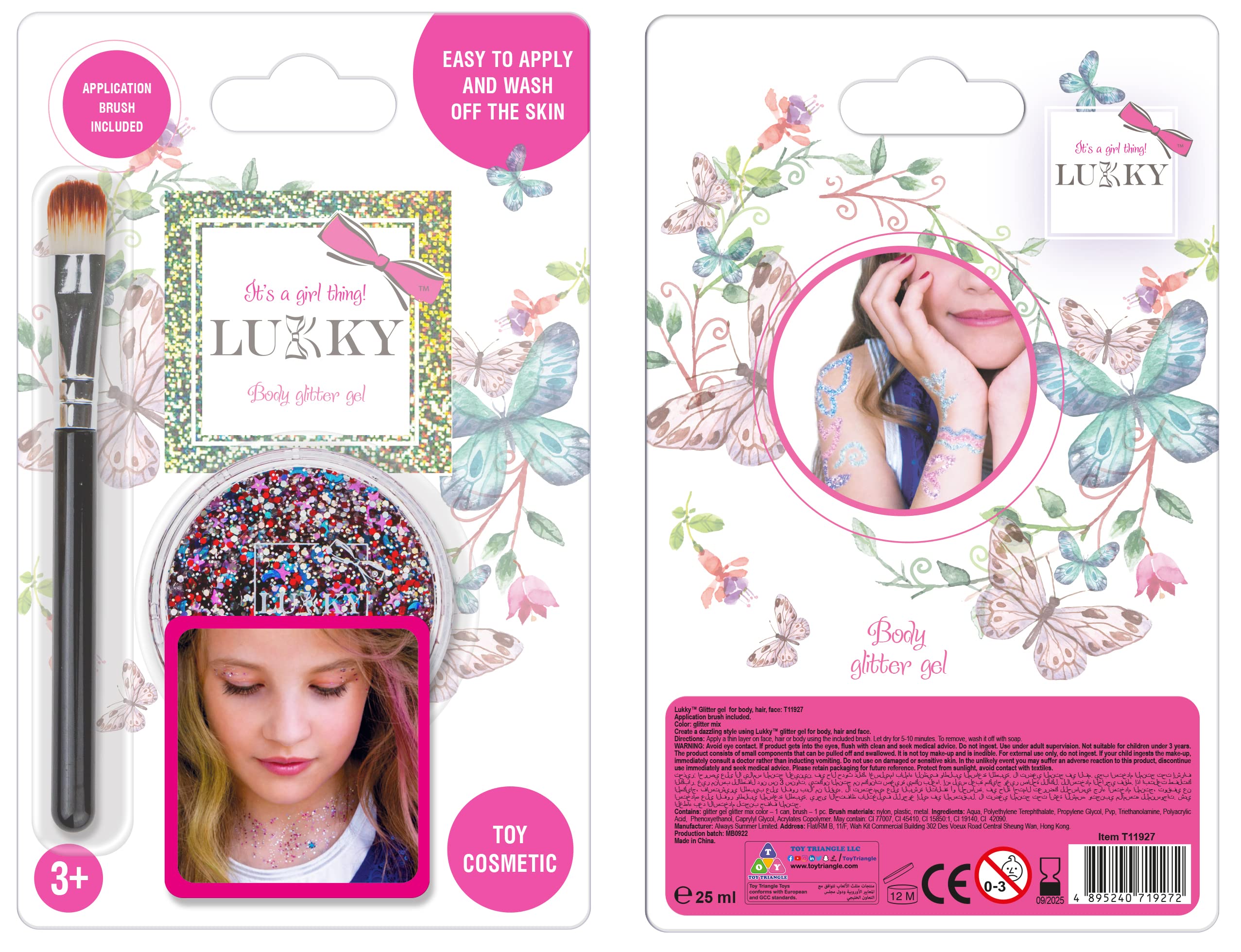 LUKKY Glitter Gel for Body, Hair, and Face: T11927, brush application included. Color: Glitter Mix. Create a dazzling style with LUKKY Glitter Gel for Body, Hair, and Face. Application: Apply a thin layer to the face, hair, or body using the included brush. Let it dry for 5 to 10 minutes. To remove, wash with soap. SAFETY WARNING For external use only. Avoid contact with eyes. Keep away from open flames or direct heat sources.