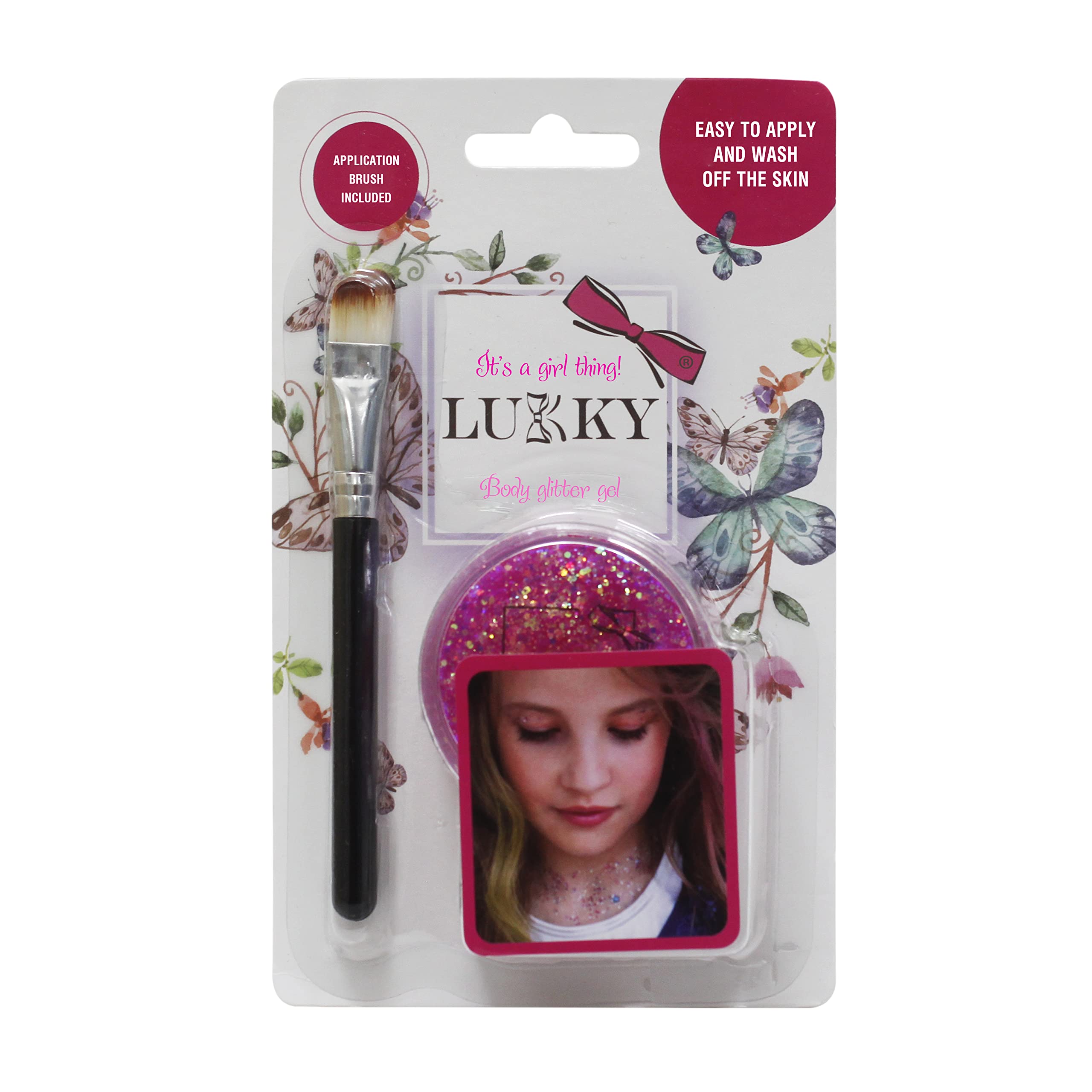 LUKKY™ Glitter Gel for Body, Hair, and Face: T15395. Application brush included. Color: Pink. Create a dazzling style using LUKKY™ Glitter Gel for body, hair, and face. Directions: Apply a thin layer to the face, hair, or body using the included brush. Let it dry for 5 to 10 minutes. To remove, wash with soap. SAFETY WARNING For external use only. Avoid contact with eyes. Keep away from open flames or direct heat sources.