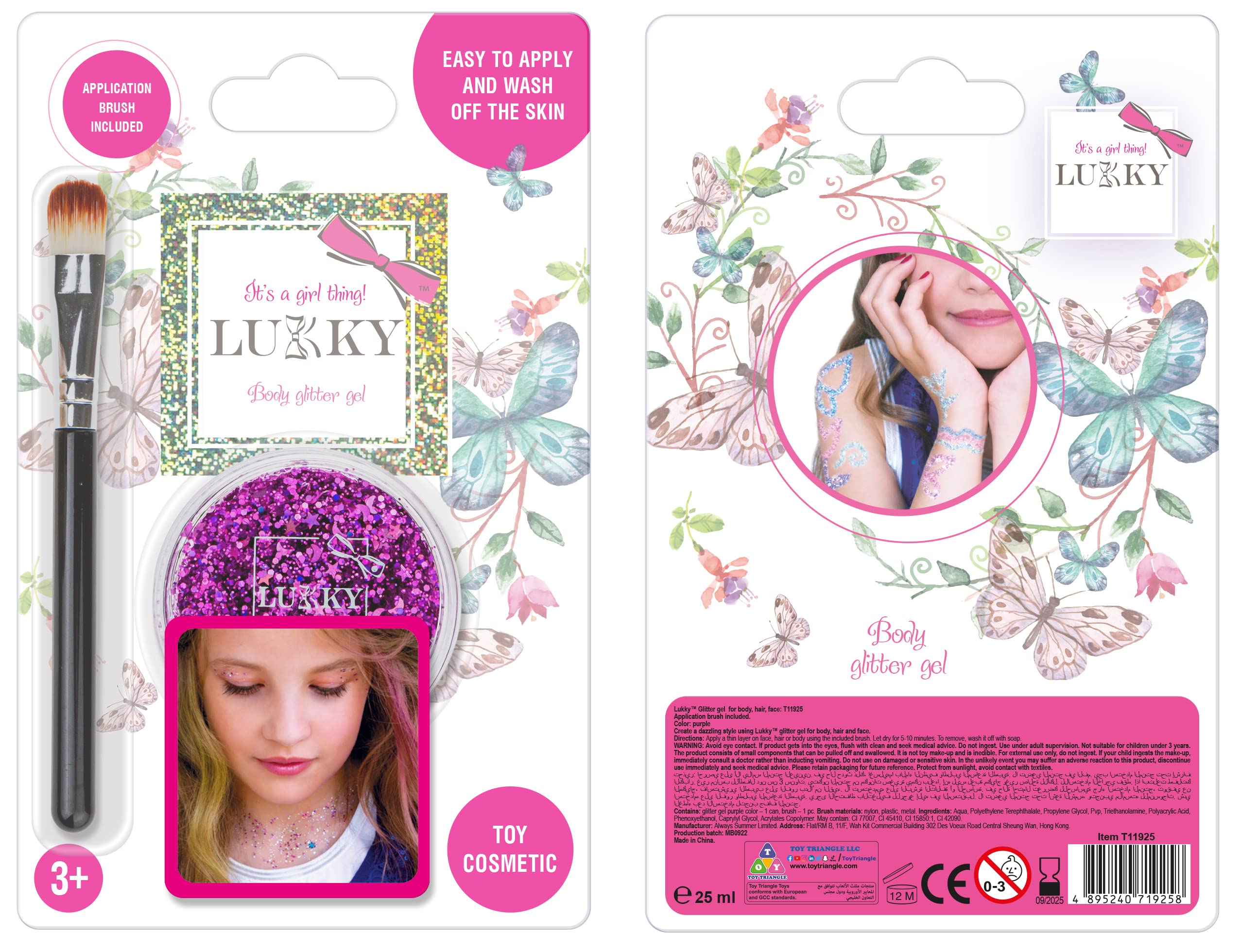 LUKKY™ Glitter Gel for Body, Hair, and Face: T11925, brush application included. Color: Purple. Create a dazzling style with LUKKY™ Glitter Gel for Body, Hair, and Face. Application: Apply a thin layer to the face, hair, or body using the included brush. Let it dry for 5 to 10 minutes. To remove, wash with soap. SAFETY WARNING For external use only. Avoid contact with eyes. Keep away from open flames or direct heat sources.