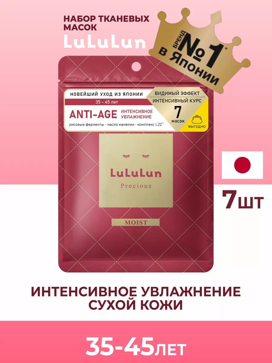 LuLuLun - тканевые маски №1 в Японии!Линия Precious разработана с учетом особых потребностей кожи от 35 до 45 лет. Маска FACE MASK PRECIOUS MOIST RED создана, чтобы продлить молодость вашей кожи, обеспечивая ее глубокое интенсивное увлажнение.Активные ингредиенты:Капсулированная рисовая сыворотка и экстракт ферментированного риса – активизируется в глубоких слоях кожи, интенсивно увлажняет, устраняет шелушения, возвращает коже мягкость и гладкость;L22 - комплекс масел, аналогичный по составу кожному жиру 22-летней девушки. Эффективно восстанавливает гидролипидный баланс кожи, возвращая ей эластичность. Содержит масла Макадамии, Жожоба и Оливы;Масло Камелии – увлажняет кожу, придает гладкость и эластичность. Снимает воспаления и поддерживает выработку коллагена;Экстракт Айвы – снимает раздражение, воспаления на коже, дарит чувство комфорта, защищает ее от агрессивных внешних воздействий и плохой экологии.Комплект из 7 масок для ежедневного использования.