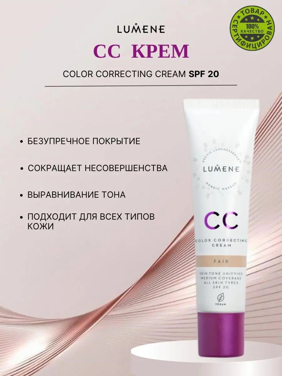 Lumene CC Color Correcting Cream - это легкая жидкая основа со средней степенью покрытия, которая уменьшает покраснения, придает ровный, свежий, и естественный вид лицу. Формула, насыщенная скандинавской брусникой, выравнивающей цвет кожи, и увлажняющей арктической родниковой водой, равномерно распределяется, сглаживая бледность и серость, обеспечивая мгновенно ровный, красивый результат. Скин защита от вредного воздействия лучей UVA/UVB (SPF 20). Подходит для всех типов кожи, интенсивно и глубоко питает сухую и нормальную, и не обостряет выделение себума на комбинированной и жирной. СС-крем Абсолютное совершенство люмене косметическое средство для достижения гладкого, идеального рельефа кожи. Он отлично подстраивается под тон, дарит блеск, создавая впечатление прозрачной вуали, второй кожи без ощущения тяжелой маски. Этот универсальный тональный крем имеет воздушную текстуру с уровнем 3/5 плотности, которая помогает скрыть несовершенства такие как: синяки вокруг глаз, темные круги, следы постакне, пигментные пятна, прыщи, черные точки, высыпания. Тональник с помощью фиксации пудрой дает возможность достичь устойчивый фарфоровый финиш, с эффектом фотошопа, фейс фильтра. Благодаря своей органической и некомедогенной формуле, продукт не забивается в поры, морщины, не выделяет шелушения, хорошо разглаживая и перекрывая их. Чудесно подходит для чувствительной и проблемной кожи, включая с акне, превосходно успокаивает обезвоженную и с куперозом лицо. Этот крем-корректор является многофункциональным продуктом, который сочетает в себе свойства тонирования, корректора, напитывания и солнцезащиты. Он позволяет закрепить макияж и обеспечивает стойкий покрывающий слой на протяжении дня. Особенность данного СС в способности придавать омолаживающее лифтинг воздействие на зрелую кожу. Данная сиси продукция замечательно подойдет для использования девочкам подросткам, девушкам, женщинам в возрасте, и визажистам как на ежедневной основе, так и в профессиональной сфере. Компактный, и в то же время мало расходуемый продукт объемом в 30 мл тюбике, очень комфортен носить в маленьких сумочках, косметичках в дорожных условиях. Он содержит только натуральные веган компоненты с уходовыми качествами. Для того чтобы хорошенько запрятать недостатки, эту декоративную косметику следует точечно наносить влажным спонжем или кистью. Тоналка люмине с спф 20 защитой от уф лучей солнца является всесезонным, можно использовать как зимой, так и летом, в жаркую или холодную погоду не течет, не размазывается, и не окисляется. Танальник представлен в 5 оттенках - ультралайт (ultra light), лайт (light), феир (fair), медиум (medium), и тан (tan), что позволяет подобрать нужный колор для обладательниц как белоснежно светлой, так и для смуглой и загорелой кожи. Продукт на 100% оригинал, поставляется с Финляндии.