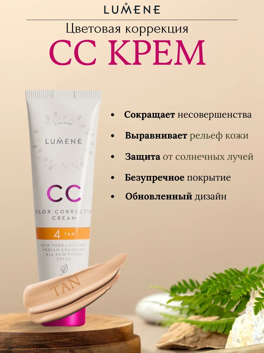 LUMENE СС крем Абсолютное совершенство SPF 20 тон Темный/shade TAN, 30 мл - это легкий и жидкий тональный крем средней степени покрытия, который помогает уменьшить покраснения и улучшить цвет лица, создавая ровный и естественный оттенок. Крем для лица легко распределяется и не закупоривает поры. Одним из ключевых преимуществ сс крема является его защитное действие от вредного воздействия уф-лучей, благодаря наличию spf 20. Это помогает предотвратить негативное воздействие солнечного излучения на кожу, поддерживая ее здоровье. Lumene cc крем также является веганским продуктом, не содержит ингредиентов животного происхождения и не тестируется на животных.