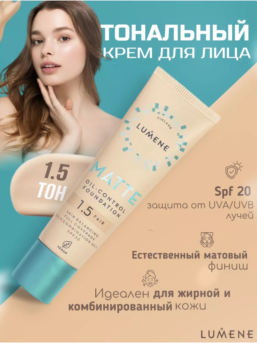 Тональный крем Matte Oil - control Foundation SPF 20 от Lumene - Ваше универсальное декоративное средство для идеального, стойкого макияжа и одновременного ухода за кожей, на весь день! С помощью профессиональной косметики Матте вы добьетесь эффекта фотошопа, второй кожи, невесомой пленки, скрывающей все недостатки. Это - жидкая матирующая основа, обеспечивающая естественное фарфоровое и свежее лицо, великолепно подходит для жирной и комбинированной кожи, легкая текстура с балансирующим ниацинамидом и нордической таволгой уменьшает излишний блеск, контролирует выработку себума, помогает уменьшить расширенные поры, и скрыть черные точки и пигментные пятна. Данная серия тональника Люмене позволяет использовать его и для нормальной кожи, чтобы достичь среднего финиша БЛЮР, а при точечном нанесении помогает маскировать прыщи, акне, синяки, круги под глазами, выровнять постакне, морщины, заломы, в целом рельеф облика. Выравнивает цвет лица и способствует достижению действия лифтинга для зрелой кожи. Отлично подойдет для девочек подростков, молодых девушек, женщинам, и дамам в возрасте. Также продукт имеет свойство успокаивать раздражение и покраснения, а имеющим аллергию к химикатам, с удовольствием пользоваться данной 100% органической тональной основой. Он обеспечивает натуральную минеральную защиту от солнца от лучей UVA/UVB ( СПФ 20 ). Этот водостойкий бьюти крем имеет плотную и в то же время лёгкую консистенцию, что дает совершенный гладкий результат без ощущения липкой маски. Крем-корректор является некомедогенным, а бережный состав обеспечивает заботу о чувствительной и проблемной коже. Уникальная таналка от Люмине имеет особенность подстраиваться под тон, сохранять влагу, увлажнять и придавать сияние коже, обладает степенью покрытия 5/5. Палитра оттенков - широкая, объем продукции в 30мл экономичен в использовании. Устойчивый танальник с солнцезащитным фактором от уф лучей можно использовать как для дневного так и для вечернего мэйкапа. Данный косметический продукт является 100% оригиналом, поставка бренда напрямую из Финляндии, реплик не имеет. Высоко оценен и зарекомендован в сфере/индустрии красоты.