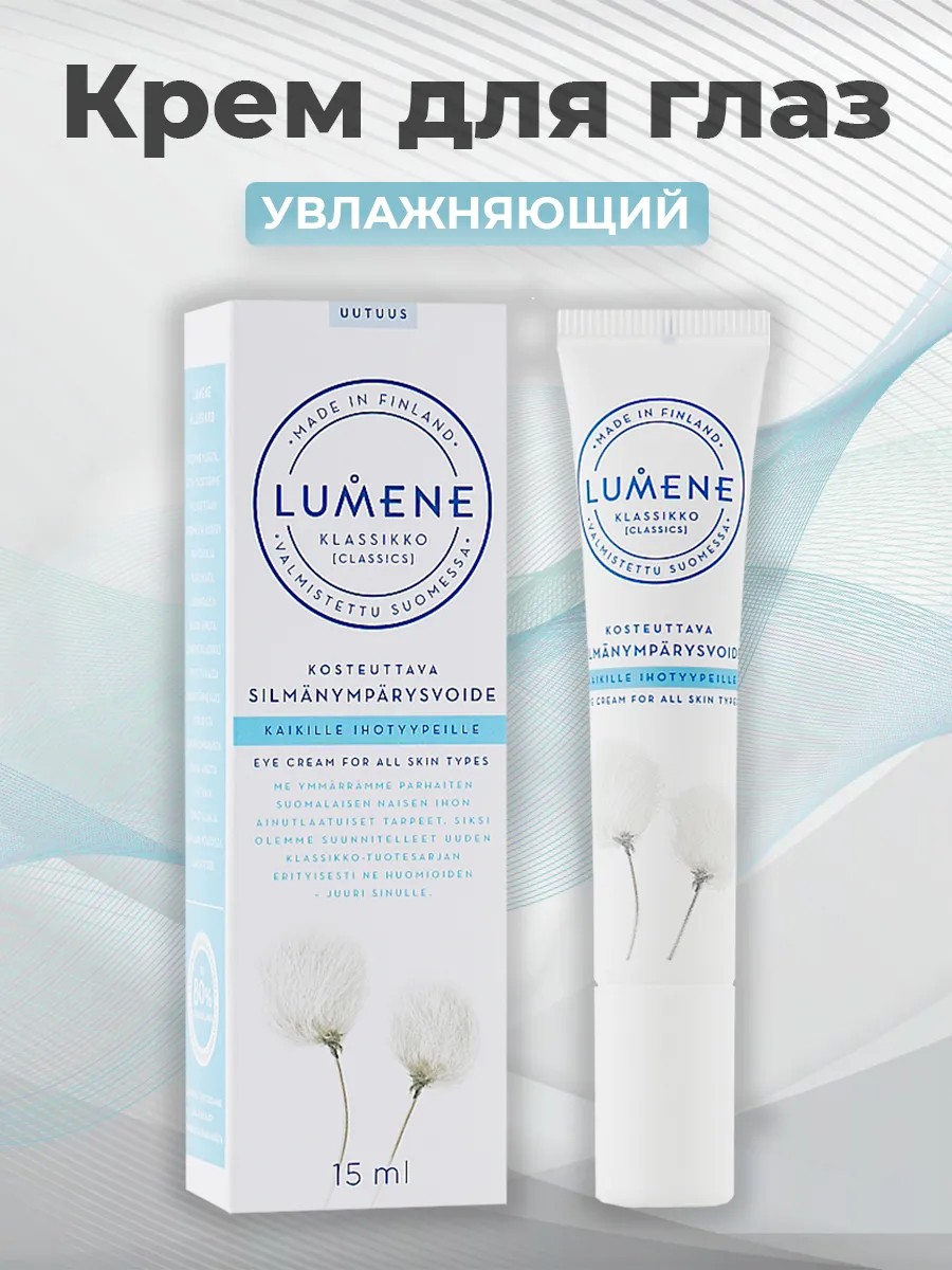 Крем для области вокруг глаз Klassikko от LUMENE Крем для области вокруг глаз оптимально увлажняет, быстро впитывается. Имеет легкую формулу без отдушек.Эффективная формула, основанная на сочетании северного хлопка и арктической родниковой воды, увлажняет, защищает и питает кожу, оставляя ее красивой и здоровой.Произведено без парабенов и производных формальдегида.Коллекция Lumene Klassikko сочетает ингредиенты, полученные из дикой природы Финляндии, такие как ухаживающий северный хлопок и чистая арктическая родниковая вода и более 80% других натуральных ингредиентов.
