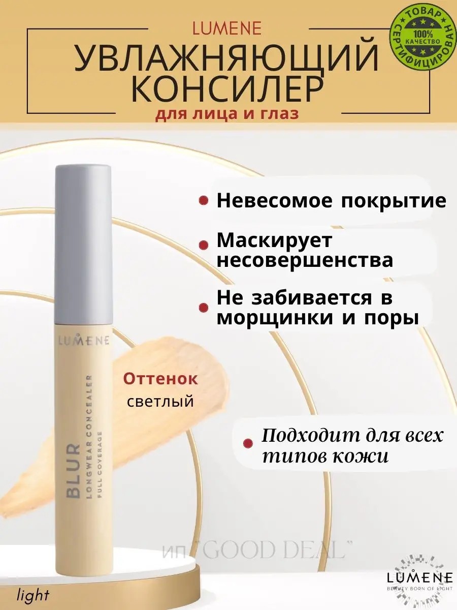 Устойчивый консилер Blur Longwear от Lumene - это легкая, органическая косметика, которая способна с легкостью скрыть морщины, темные круги, пигментные пятна, воспаление и другие недостатки, гарантируя вам безупречный результат. Этот декоративный продукт от люмене для макияжа с плотной и в то же время с невесомой текстурой легко растушевывается, не скатывается и не забивается в морщинки и поры. Крем консилер не только выполняет тонирующие свойства, но и уходовые за кожей благодаря своей питательной формуле. Отлично маскирует несовершенства кожи такие как: синяки под глазами, красные пятна на лице, прыщи, акне и т.д. Тональный корректор со светоотражающими частицами обеспечивает увлажнение кожи, стойкое покрытие и полу- матовый, фарфоровый финиш. Тональная основа подходит для жирной, сухой, комбинированной, проблемной (для всех типов кожи), а также для возрастной. Формула обогащенная увлажняющей арктической родниковой водой и ухаживающим северным вереском, придает коже естественно ровный и безупречный тон. Финская родниковая вода секрет красивой и здоровой кожи. Благодаря низкому содержанию минеральных веществ и благоприятному для кожи рН, идеально подходит для увлажнения кожи. Также содержит активные компоненты для глубокого ухода за кожей. Цветок вереска, собранный в широтах за Полярным кругом, обладает мощным противовоспалительными и омолаживающими свойствами. Он успокаивает кожу улучшает ее упругость и эластичность. Мультифункциональный корректор Люмине является базой под тональный крем, обеспечивая скрытие нежелательных пятен на коже. Нанесите с помощью аппликатора или пальцев на несовершенства в области лица, требующие точечной маскировки. Аккуратными впечатывающими движениями растушуйте. Можно наслаивать для более плотного покрытия. Консиллер также отлично подойдет для использования вместо тонального крема, если вы применяете его лишь для коррекции маленьких участков. Крем коректор ложиться на кожу ровным слоем, создавая безупречный и естественный макияж.