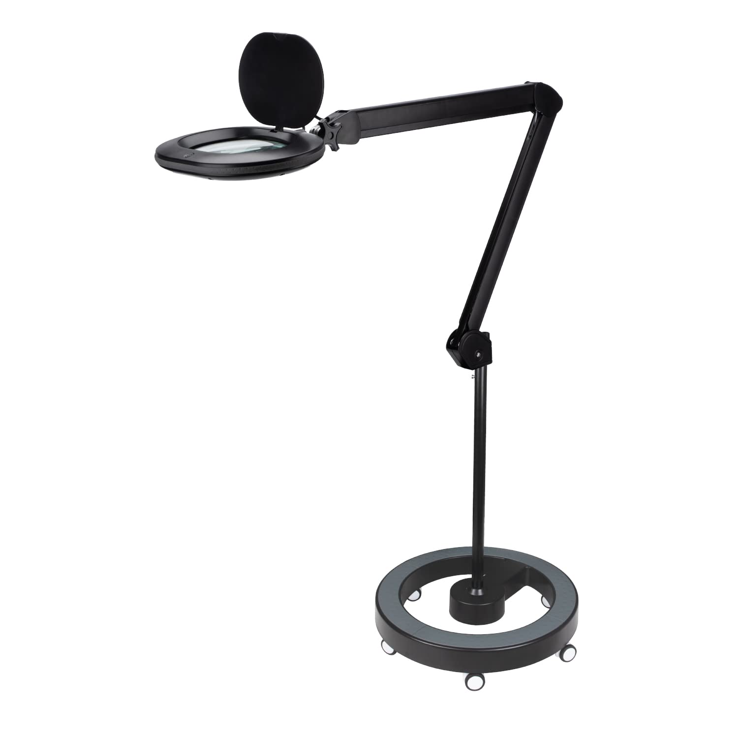 Scope of delivery: Lumeno magnifying lamp 861x, table clamp, power supply (20 V / 0.5 a), instructions, rolling tripod 6159. Crystal-clear oval glass lens 110 x 150 mm with low distortion for an optimal visual area, 3 dioptries (1.75-fold enlargement) to5 dioptries (2.25 times magnification) are suitable, for example, for cosmetics, handicrafts and hobby, as reading aids.Slightly movable arm mechanics without risk of clamping and large working radius, length of the upper arm segment: 42 cm, length of the lower arm seedment: 42 cm, dimensions of the lamp head: 19 x 24.5 x 4.2 cm.Uniform illumination of the work area with 60 UltraBright LEDs with a very low power consumption of only 10 watts, brightness adjustable in 2 steps 450 lumens (level 1) 950 lumens (level 2).Lumeno 861XSW incl. Rollstiv 6159, with oval, extra large 110 x 150 mm glass lens, available with 3 diopters (1.75 times) or 5 diopters (2.25 times), two brightness levels (max. 950 lumens), blackWith a gray rubber protection edge.Lieferumfang: Lumeno Lupenleuchte 861X, Tischklemme, Netzteil (20 V / 0,5 A), Anleitung, Rollstativ 6159. Kristallklare ovale Glaslinse 110 x 150 mm mit geringer Verzerrung für einen optimalen Sichtbereich, 3 Dioptrien (1,75-fache Vergrößerung) bis 5 Dioptrien (2,25-fache Vergrößerung) eignen sich z.B. für Kosmetik, Handwerk und Hobby, als Lesehilfe. Leicht bewegliche Armmechanik ohne Klemmgefahr und großer Arbeitsradius, Länge des oberen Armsegments: 42 cm, Länge des unteren Armsegments: 42 cm, Maße Lampenkopf: 19 x 24,5 x 4,2 cm. Gleichmäßige Ausleuchtung des Arbeitsbereichs mit 60 ultrabright LEDs mit einem sehr geringen Stromverbrauch von nur 10 Watt, Helligkeit in 2 Stufen einstellbar 450 Lumen (Stufe 1) 950 Lumen (Stufe 2). Lumeno 861XSW inkl. Rollstativ 6159, mit ovaler, extra großer 110 x 150 mm Glaslinse, erhältlich mit 3 Dioptrien (1,75-fach) oder 5 Dioptrien (2,25-fach), zwei Helligkeitsstufen (max. 950 Lumen), schwarz mit grauer Gummischutzkante.Lumeno 8615SW Lupenleuchte Arbeitsplatzlampe mit großer ovalen Linse 110x150 mm, 60 LEDs in 2 Stufen dimmbar, perfekt als Lesehilfe, für die Kosmetik, zum Löten, 5 Dioptrien schwarz mit Rollstativ Schwarz 5 mit Rollstativ