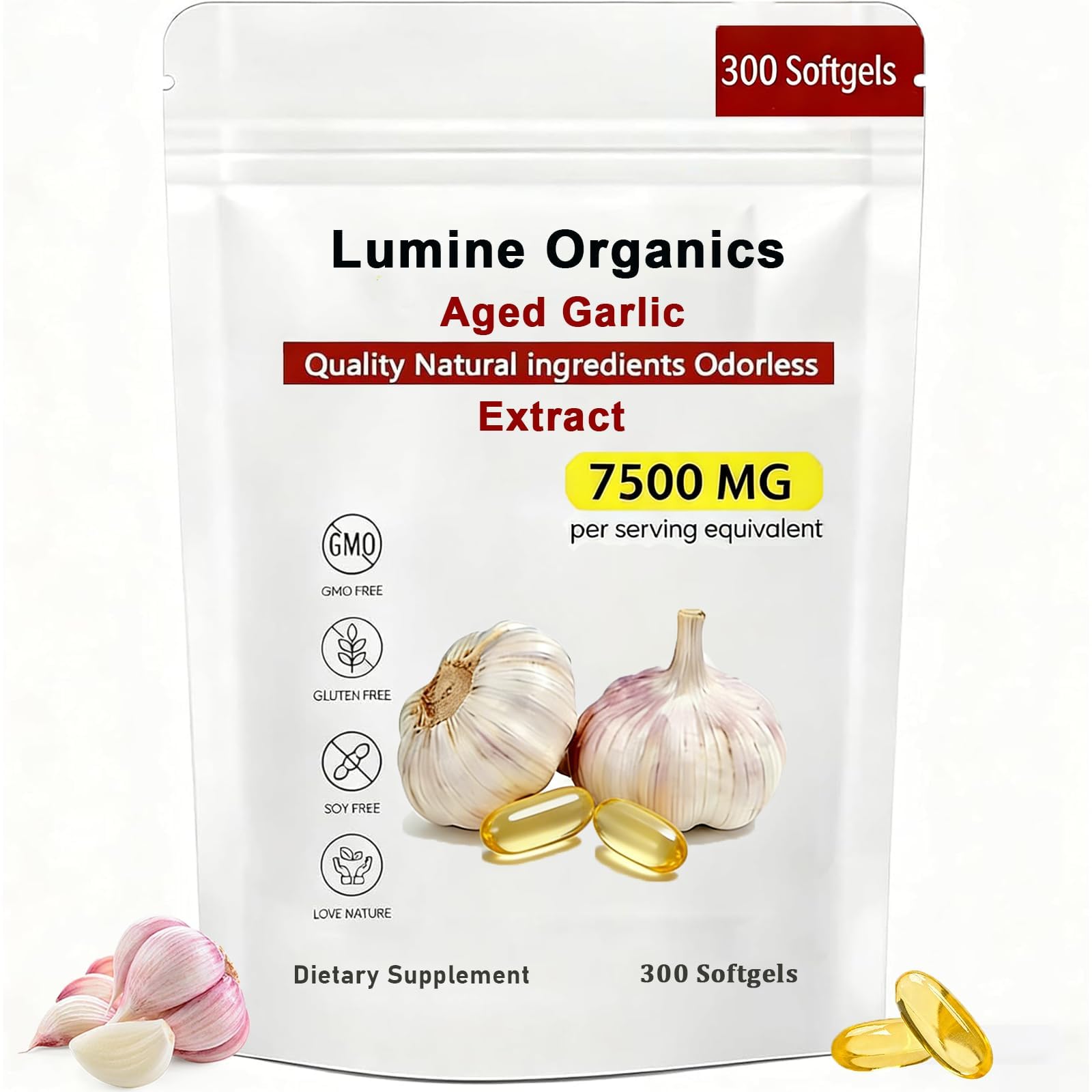 : Lumine Organics Aged Garlic Extract Capsules feature premium organic garlic naturally aged for 24 months, delivering 7,500mg of potent extract per capsule. Our odorless extraction technology preserves garlic's full essence while eliminating pungent odors, letting you enjoy all its benefits without social awkwardness. Gentle Formula, Trusted Nourishment Highly Concentrated, Efficient Absorption Daily Commitment, Natural Protection Lumine Organics believes true quality stems from purity and dedication. We focus on delivering simple, effective, and hassle-free supplement solutions.Advanced Processing, Convenient Storage Low-temperature extraction technology reduces allicin content for a truly "odorless" experience. Occasional capsule sticking does not affect quality—gently shake to separate, ensuring each capsule remains fresh and potent. Pure Formula, Zero Additive Burden Free from gluten, soy, dairy, GMOs, and artificial additives. This gentle, pure formulation suits all constitutions for long-term use, effortlessly integrating into daily life. Two Years of Natural Aging, Purely Organic Crafted exclusively from organic garlic, our extract undergoes a rigorous two-year natural aging process. This enhances the stability of active compounds, minimizes off-flavors, and maximizes the preservation of natural antioxidant power. Lumine Organics Aged Garlic Extract Each softgel delivers 7500mg of aged garlic extract with a potent 15:1 concentration ratio. This nutrient-dense formula ensures superior absorption, providing your daily requirement in a single convenient capsule. Lumine Organics Aged Garlic utilizes odorless technology to effectively preserve garlic's essence while eliminating pungent odors and irritation. Gentle and easily absorbed, it delivers a pure, hassle-free daily wellness experience.