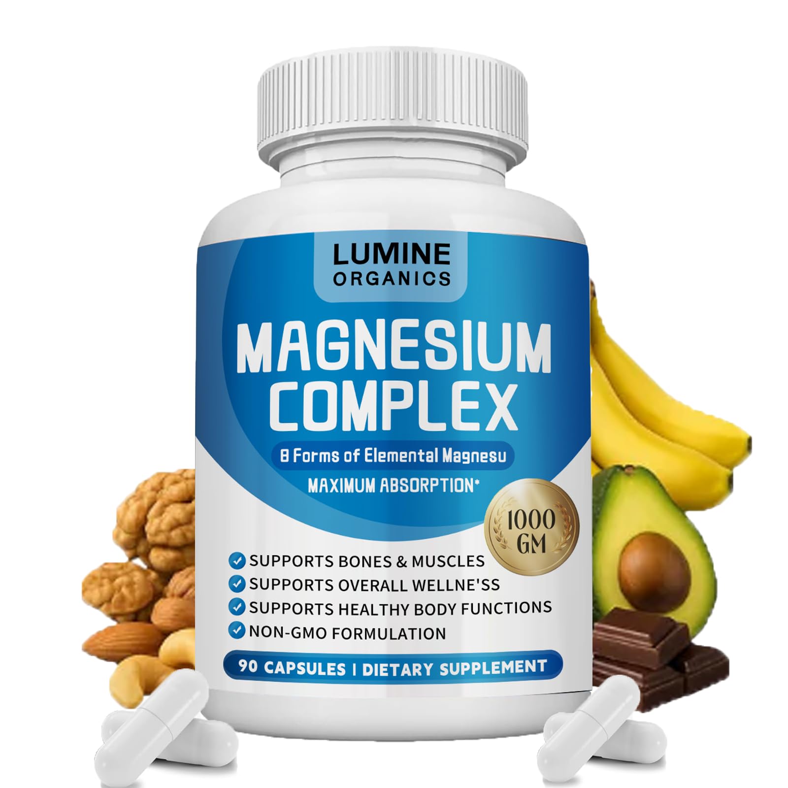 : Lumine Organics Magnesium Complex Supplement 1000mg - Advanced 8-in-1 Magnesium Blend - Glycinate, Citrate, Malate, Taurate etc.– High Absorption Formula – Non-GMO, 90 Capsules 8 Essential Elemental Magnesium Types Maximum Absorption Bioavailability Promotes Relaxation Calmness