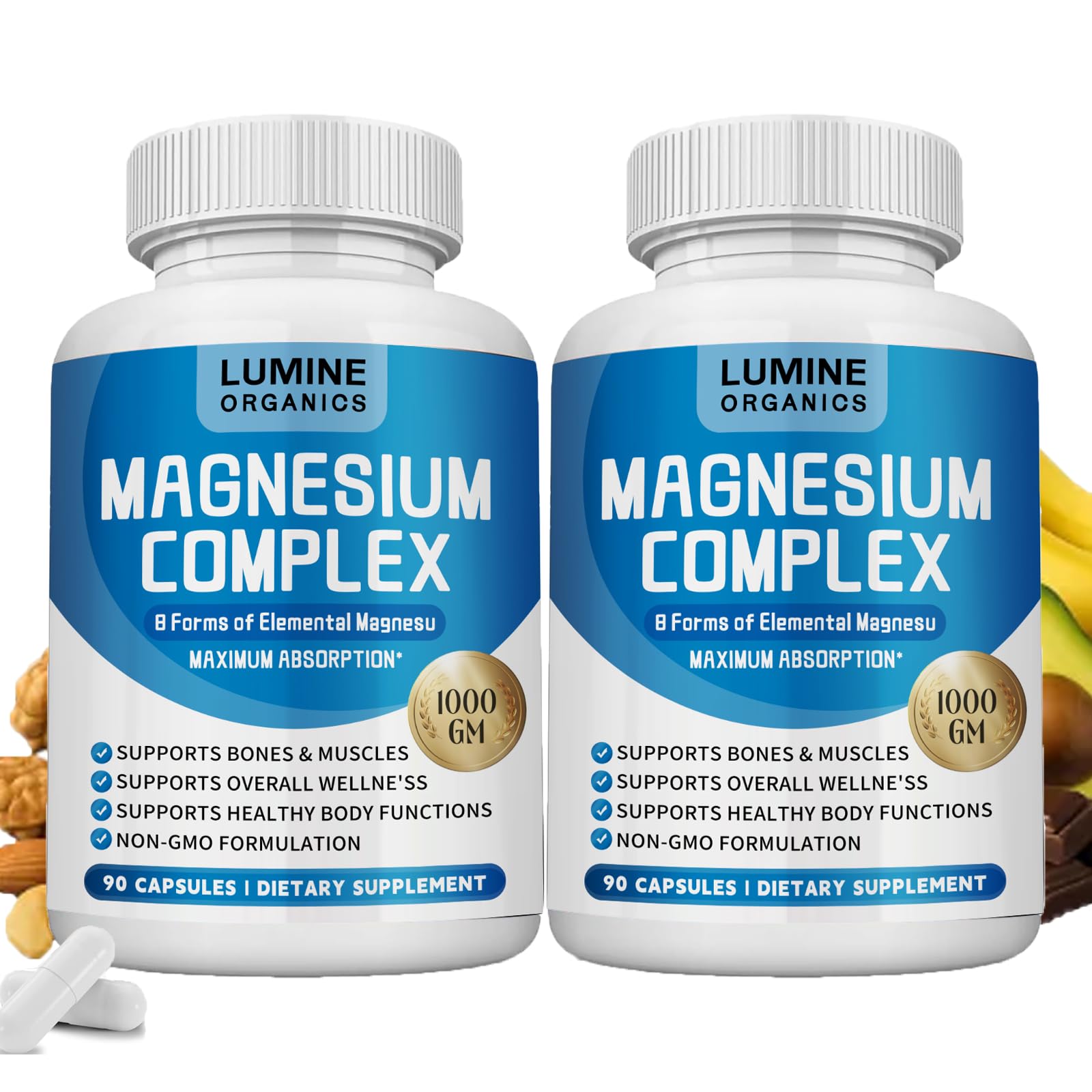 High-Potency Extended-Release Formula Each serving provides 1000mg of magnesium. The 90-capsule bottle offers three months of daily supplementation—convenient and hassle-free support for maintaining optimal magnesium balance. Pure Formula, Trusted Choice Lumine Organics All ingredients are non-GMO, gluten-free, and free from artificial preservatives and synthetic colors. Each capsule delivers pure magnesium nutrition, suitable for diverse dietary needs with worry-free care. Energy Metabolism Protein Synthesis Magnesium participates in hundreds of enzymatic reactions within the body, serving as a key factor in energy production and protein synthesis. Daily supplementation helps maintain metabolic vitality, supporting efficient energy levels and physiological functions. Relaxation Recovery This highly absorbable magnesium complex helps alleviate muscle tension after exercise or daily activities, supports smooth bodily functions, promotes rapid recovery, and enhances athletic performance and overall comfort. Eight-Magnesium Synergy Scientifically blends eight highly bioavailable magnesium forms—including glycine magnesium, citrate magnesium, malate magnesium, taurine magnesium, magnesium oxide, and aspartate magnesium—to create multiple absorption pathways that work synergistically. This enhances bioavailability, comprehensively meeting the body's daily magnesium requirements for efficient absorption.