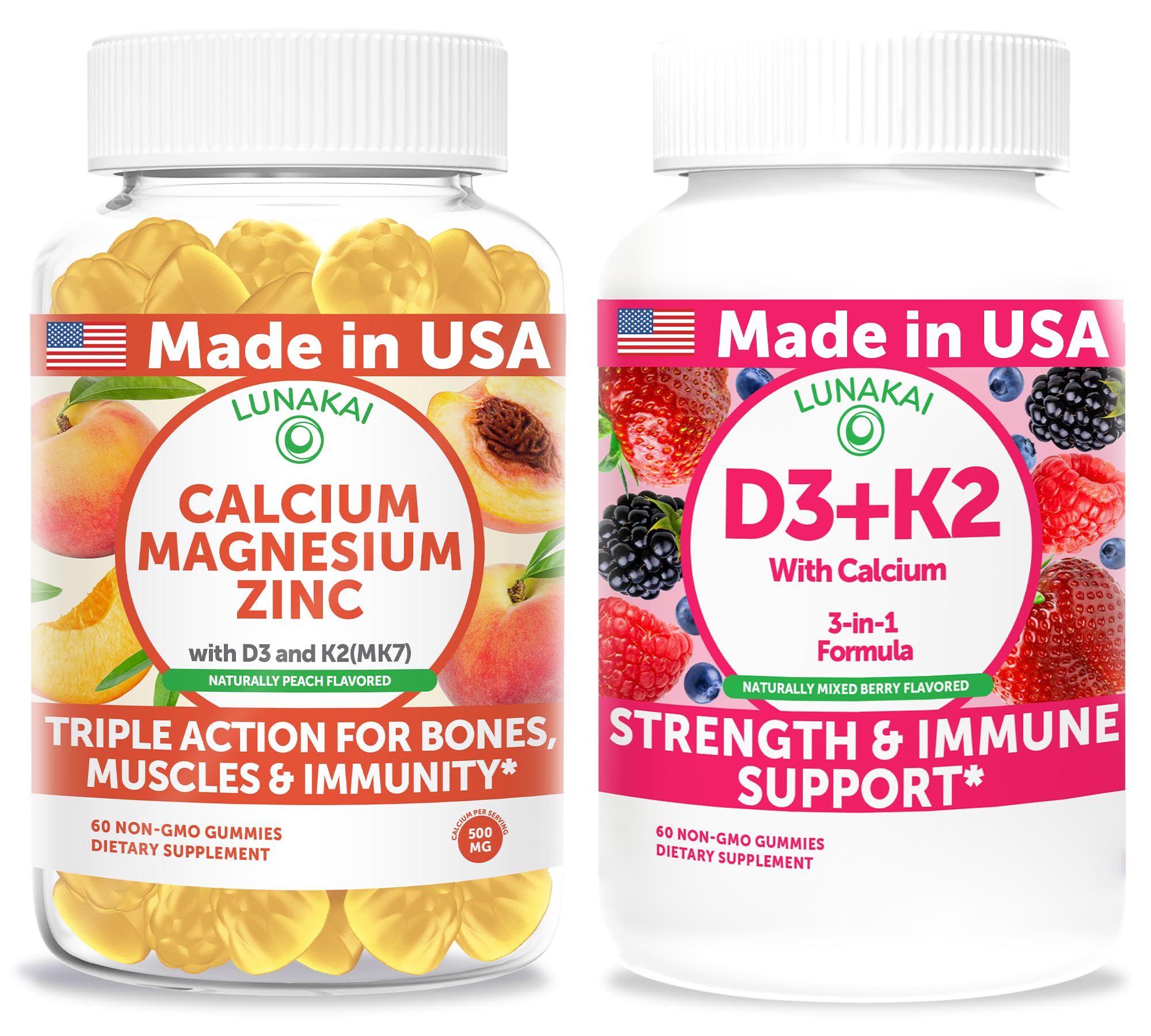 Lunakai USA Made Calcium Magnesium Zinc + D3 + K2 Gummies Bundle Naturally Flavored Non-GMO 60ct Each