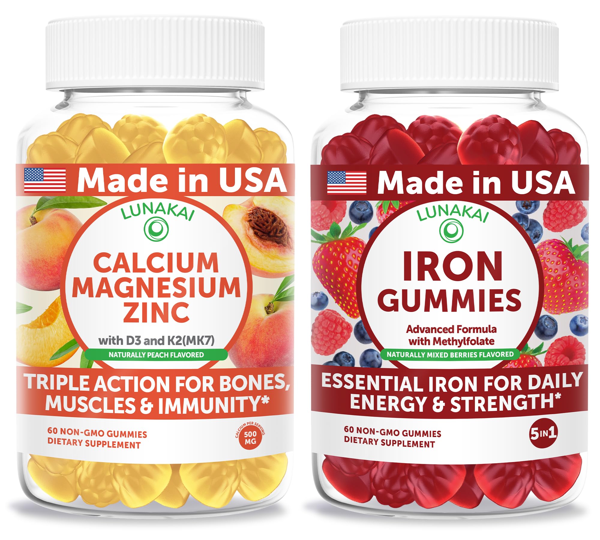 Lunakai USA Made Calcium Magnesium Zinc + Iron Gummies Bundle Naturally Flavored Non-GMO 60ct Each