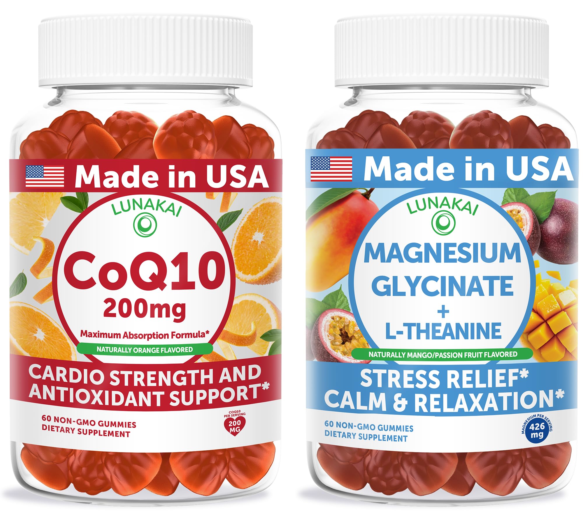 Lunakai USA Made CoQ10 200mg + Magnesium Glycinate with L-Theanine Gummies Bundle Naturally Flavored Non-GMO 60ct Each