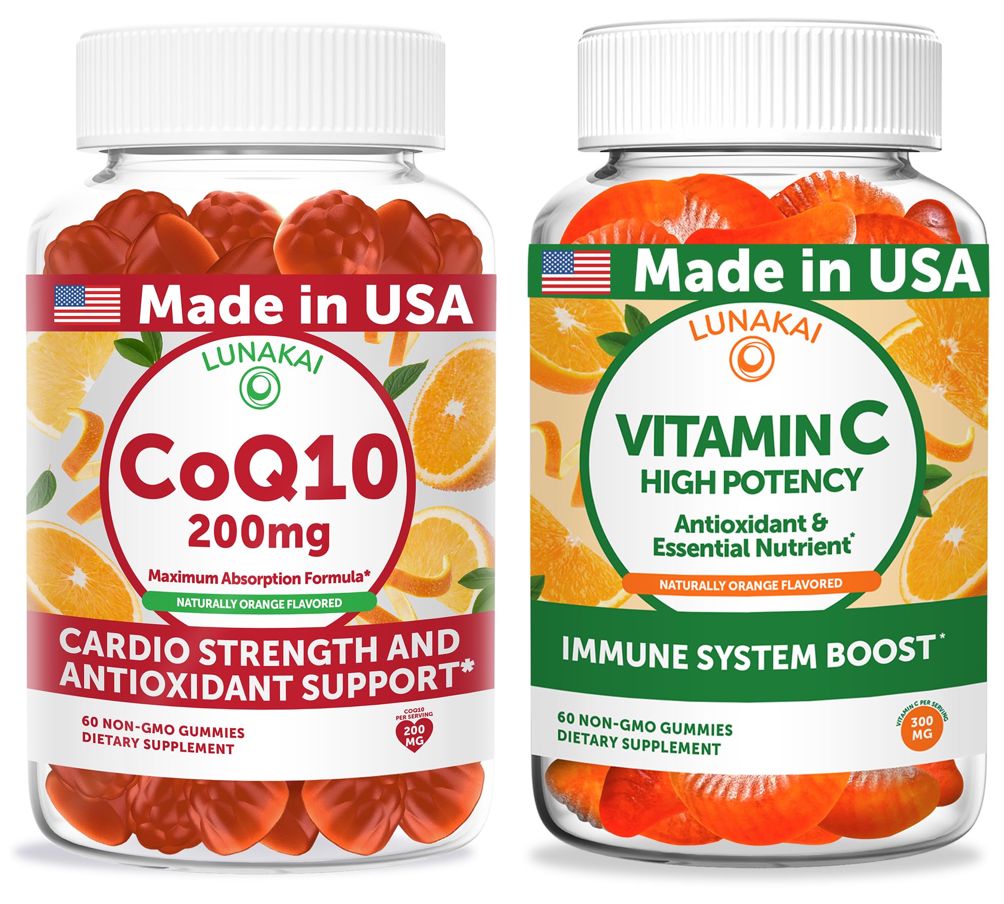 Lunakai USA Made CoQ10 200mg + Vitamin C 300mg Gummies Bundle Naturally Flavored Non-GMO 60ct Each