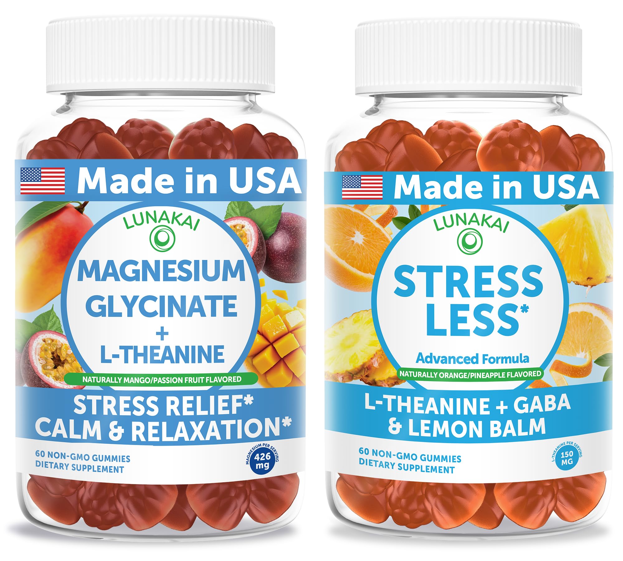 Lunakai USA Made Magnesium Glycinate with L-Theanine + Stress Less Gummies Bundle Naturally Flavored Non-GMO 60ct Each