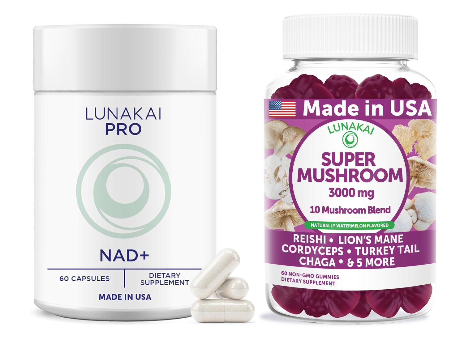 Bundle Set – Includes one bottle of Lunakai PRO NAD Capsules (60 capsules) and one bottle of Lunakai Super Mushroom Gummies (60 gummies). Made in the USA Non-GMO – Produced with high standards and made without GMO ingredients. Two Daily Formats – Combines capsules and gummies for routine flexibility and convenience. Super Mushroom Gummies (3000 mg) – Includes a 10 mushroom blend with Reishi, Lion's Mane, Cordyceps, Turkey Tail, Chaga more. PRO NAD Capsules – Easy-to-take capsule format designed for daily supplementation.