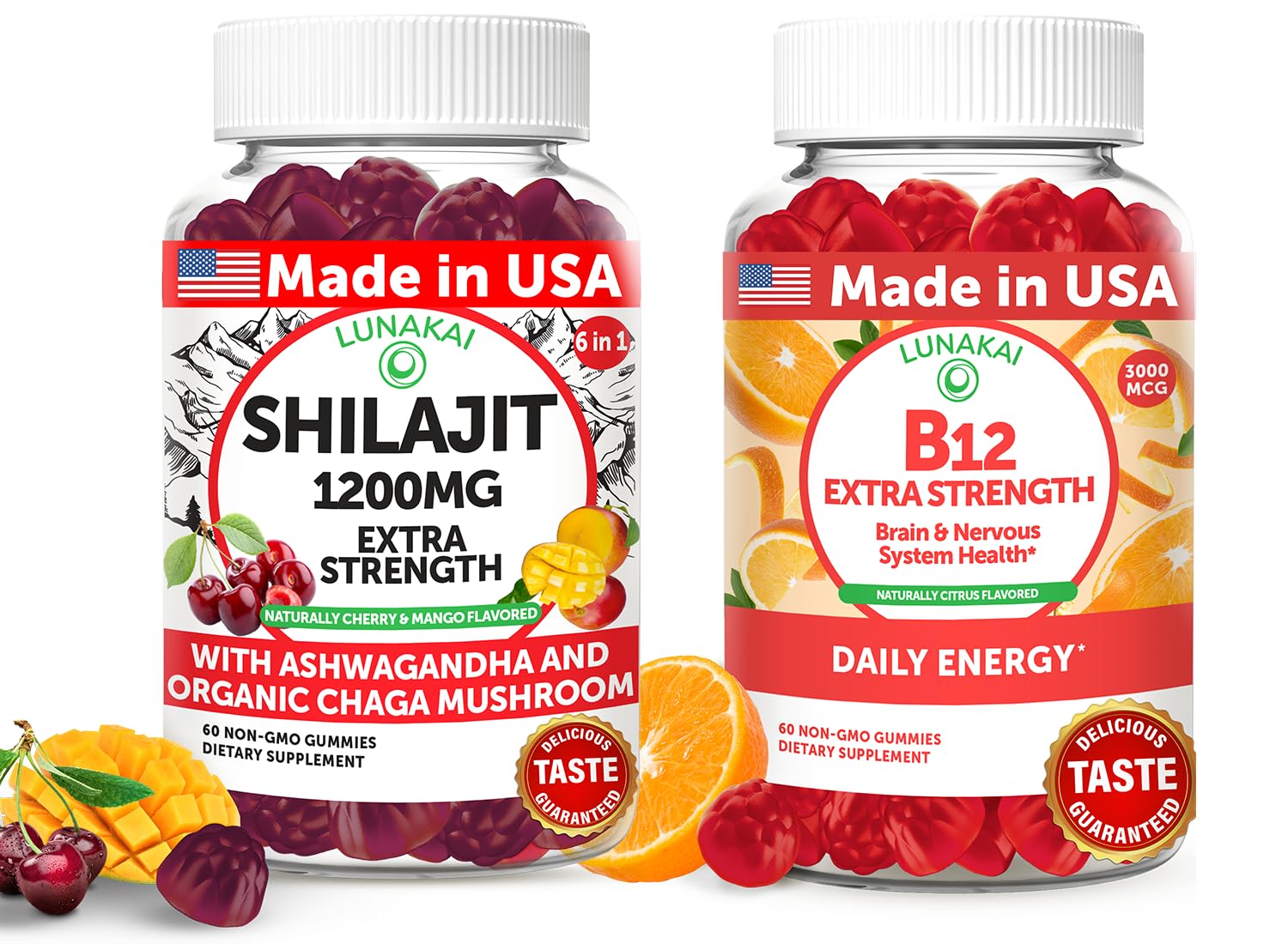 Lunakai USA Made Shilajit & B12 Extra Strength Gummies Bundle Energy Focus and Daily Wellness Vegan & Delicious