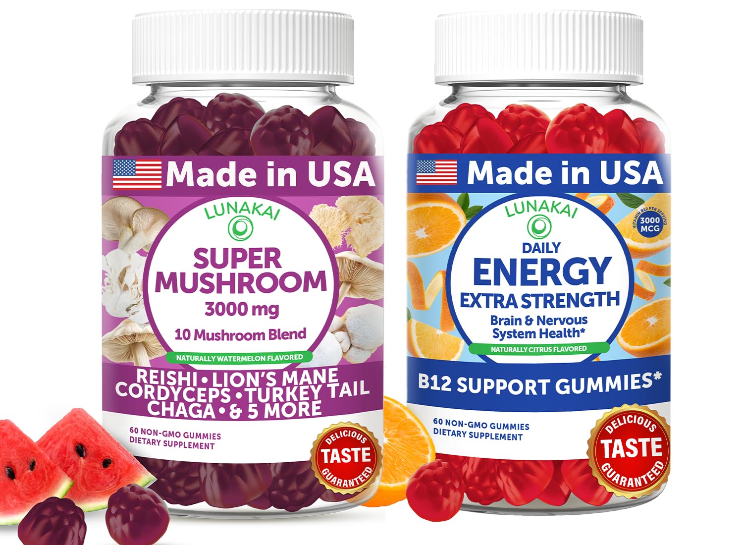 Lunakai USA Made Super Mushroom & Energy B12 Gummies Bundle 10-Mushroom Complex & Daily B12 Support 60 Non-GMO Gummies Each
