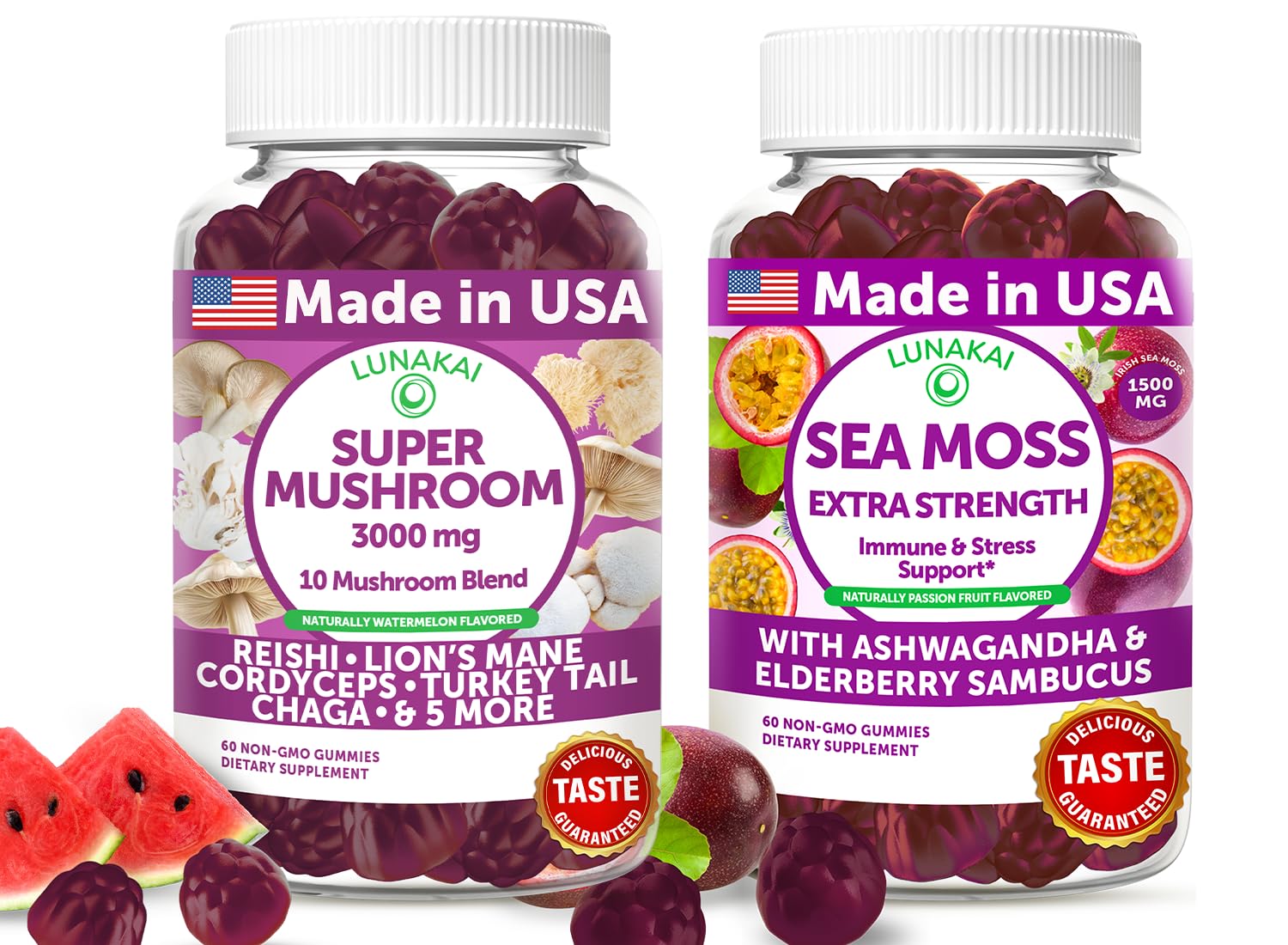 Lunakai USA Made Super Mushroom & Sea Moss Gummies Bundle 10-Mushroom Complex & Daily Wellness Support 60 Non-GMO Gummies Each