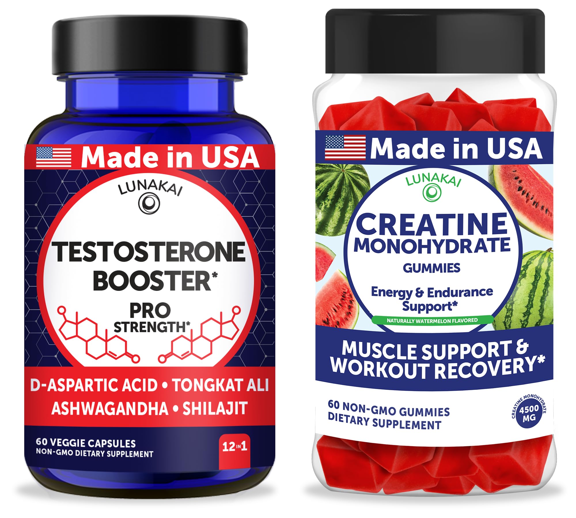 Lunakai USA Made Testosterone Booster Capsules + Creatine Monohydrate Gummies Bundle Non-GMO 60ct Each