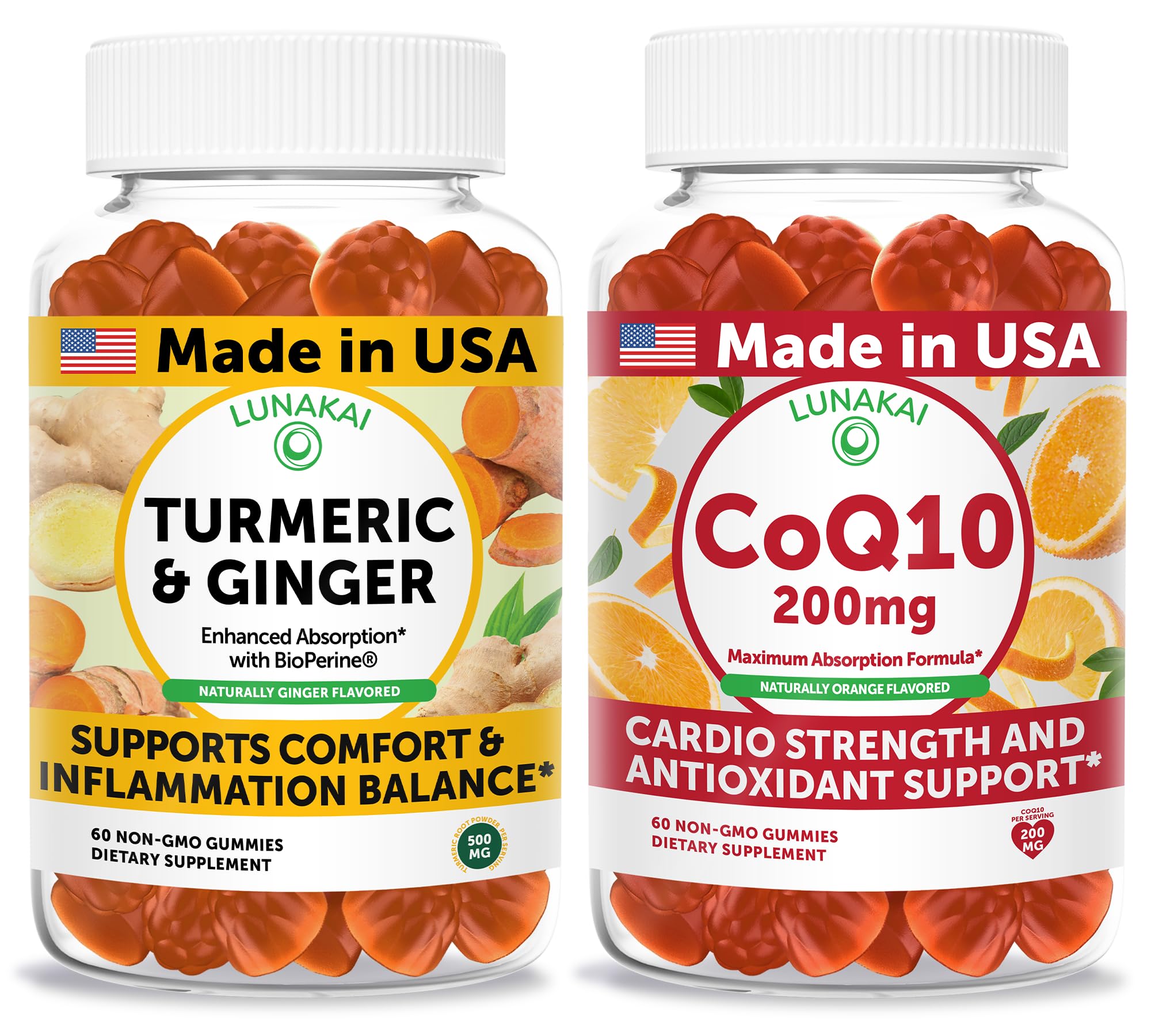 Bundle Set – Includes one bottle of Turmeric Ginger and one bottle of CoQ10, each with 60 gummies. Made in the USA Non-GMO – Crafted with care and free from artificial colors or flavors. Naturally Flavored Gummies – Ginger flavor for Turmeric Ginger and orange flavor for CoQ10. CoQ10 200mg Gummies – Provides 200 mg per serving in a naturally orange-flavored gummy. Turmeric Ginger Gummies – Features turmeric and ginger with BioPerine for enhanced absorption.