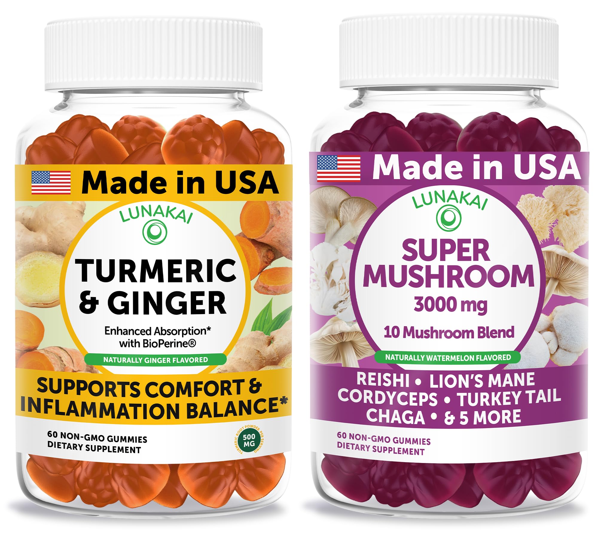 Lunakai USA Made Turmeric & Ginger + Super Mushroom Gummies Bundle Naturally Flavored Non-GMO 60ct Each