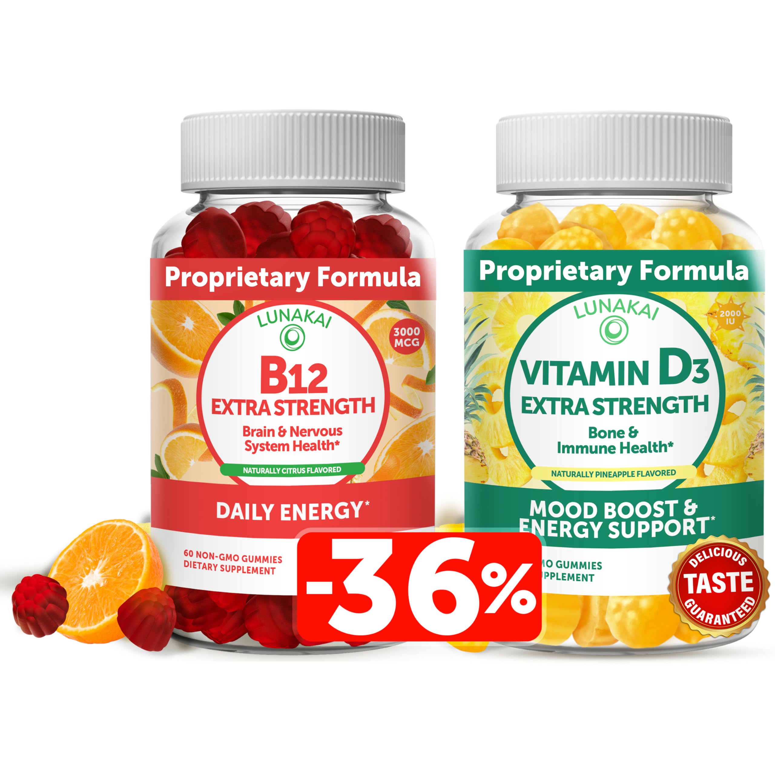 Lunakai Vitamin D3 and Vitamin B12 Gummies Bundle - Immunity Bone and Mood Support VIT D3 2000IU Supplement - 3000mcg Methylcobalamin High Absorption Energy Gummy