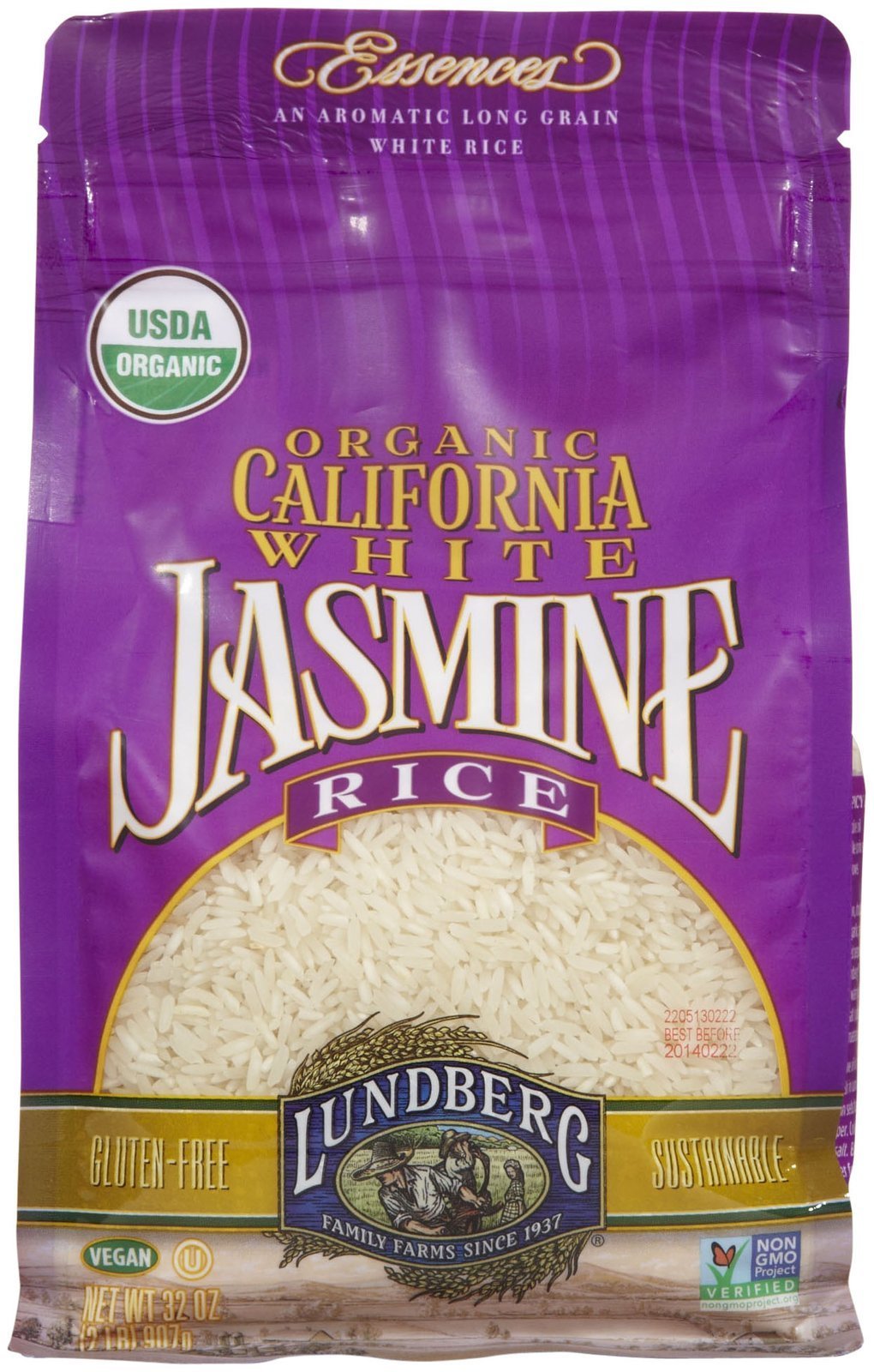 Lundberg Organic Jasmine White Rice - Gluten Free Jasmine is an aromatic long grain rice originally grown only in Thailand. While cooking, this exotic rice fills your kitchen with a delicate scent. The grains cook up moist and tender with a soft texture and delicious flavor. Jasmine rice is very versatile - use it as a side dish or in pilafs and desserts. Features: 100% Organic Kosher Gluten Free Wheat Free
