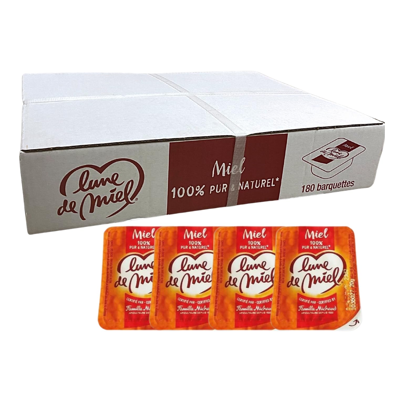 : Choose the box of 180 Lune de Miel honey trays, a true natural treasure in individual 20-gram portions! Lune de Miel offers 100 pure and natural honey, certified by a Cofrac-accredited laboratory for impeccable floral and geographical traceability. The bees, in perfect health thanks to ideal and natural living conditions, produce superior quality honey. Lune de Miel collaborates with passionate beekeepers who place their hives in protected areas. These 180 convenient trays are perfect for adding variety to your breakfasts, snacks, pancakes, and waffles. They are also ideal for catering professionals and tourist accommodations, offering impeccable hygiene and a waste-reducing solution. This honey, with no additives, added sugar, or preservatives, is perfect to take everywhere, whether to the office, on a picnic, or while traveling. Each container contains only nectar transformed by the bees, guaranteeing an authentic and natural taste experience. Ingredients: honey[Multi-Purpose] Suitable for catering and accommodation: Convenient to take to the office, on vacation, or for a picnic. [Healthy Environment] Hives located in protected natural areas: Healthy bees for high-quality honey. [Large Quantity] Carton of 180 trays: Ideal for breakfasts, snacks, pancakes, and waffles with no waste. [Cofrac Certification] Honey certified by an independent laboratory: Verified floral and geographical origin. [HONEYMOON] 180 trays: Individual 20-gram portions, 100 pure and natural, with no additives or preservatives.Description du produit Optez pour le carton de 180 barquettes de miel Lune de Miel, un véritable trésor naturel en portions individuelles de 20 grammes ! Lune de Miel vous propose un miel 100 pur et naturel, certifié par un laboratoire accrédité Cofrac pour une traçabilité florale et géographique impeccable. Les abeilles, en parfaite santé grâce à des conditions de vie idéales et naturelles, produisent un miel de qualité supérieure. Lune de Miel collabore avec des apiculteurs passionnés qui placent leurs ruches dans des terroirs préservés. Ces 180 barquettes pratiques sont parfaites pour diversifier vos petits déjeuners, goûters, crêpes et gaufres. Elles sont également idéales pour les professionnels de la restauration et les hébergements touristiques, offrant une hygiène irréprochable et une solution anti-gaspillage. Ce miel sans additifs, sans sucre ajouté ni conservateurs, est parfait à emporter partout, que ce soit au bureau, en pique-nique ou en voyage. Chaque barquette contient uniquement le nectar transformé par les abeilles, garantissant une expérience gustative authentique et naturelle. Ingrédients miel[Multi-Usages] Convient pour la restauration et l'hébergement : Pratique à emporter au bureau, en vacances ou en pique-nique. [Environnement Sain] Ruches situées dans des zones naturelles protégées : Abeilles en pleine santé pour un miel de haute qualité. [Grande Quantité] Carton de 180 barquettes : Idéal pour les petits déjeuners, goûters, crêpes et gaufres sans gaspillage. [Certification Cofrac] Miel certifié par un laboratoire indépendant : Origine florale et géographique vérifiée. [LUNE DE MIEL] 180 barquettes : Portions individuelles de 20 grammes, 100 pur et naturel, sans additifs ni conservateurs.LUNE DE MIEL 180 Barquettes de miel portions individuelles de 20 grammes
