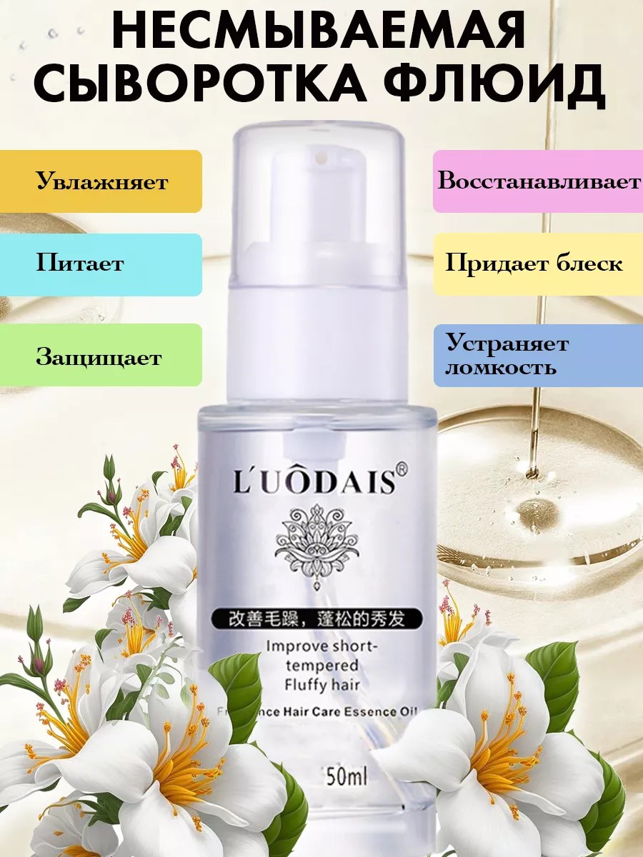 Introducing a leave-in hair serum-fluid with a moisturizing, restorative, and strengthening effect! This professional care product features a complex nourishing formula based on natural oils. This lightweight texture spreads easily through hair and is quickly absorbed. It helps strengthen strands from root to tip. The effective perfumed formula leaves a pleasant, subtle scent. It helps combat hair loss, breakage, and dryness, eliminates frizz, and provides heat protection. This fluid with organic active ingredients makes combing easier and can be used before straightening or styling. This product, from a pharmacy line, is suitable for various hair types for both men and women. It will add shine and smoothness to porous, dry, damaged, dull, and brittle hair, moisturize split ends, and soften unruly strands. This premium leave-in serum comes in a beautiful 50 ml bottle with a convenient dispenser. This beauty product also comes in branded cardboard packaging. This serum moisturizes, strengthens, and restores lifeless and problematic hair. It will nourish straight, curly, and wavy locks of varying thicknesses and lengths. It's the ideal choice for adult men and women, girls and boys, who value the beauty and health of their hair. This beneficial product with protective and nourishing properties is suitable for color-treated and natural curls, as well as straight strands. It will reduce frizz and breakage. This fluid will help provide salon-quality hair care at home. It's also an excellent choice for professional stylists and hairdressers. We have special offers and sales, so you can buy our products as gifts at a discount!