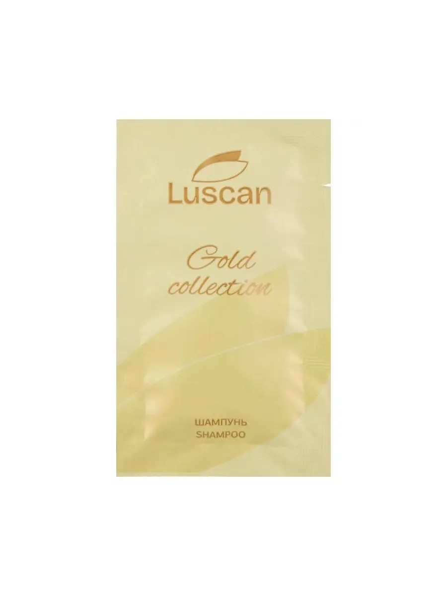 Luscan Gold Collection Shampoo 10 ml sachets (500 pieces per package). Luscan Gold Collection shampoo deeply cleanses hair and moisturizes the scalp, created specifically for daily hair care. How to use: apply shampoo to damp hair, lather, distribute evenly with massage movements along the entire length, paying special attention to the root zone. Then rinse thoroughly with water and use conditioner or balm. Ingredients: Aqua, Sodium Laureth Sulfate, Cocamidopropyl Betaine, Sodium Chloride, Polyquaternium-7, Hydrolyzed Wheat Protein, Disodium EDTA, Citric Acid, Methylchloroisothiazolinone, Methylisothiazolinone, Parfum, DMDM Hydantoin. Shelf life: 24 months from the date of manufacture indicated on the package. Quantity per package: supplied in packs of 500 sachets.